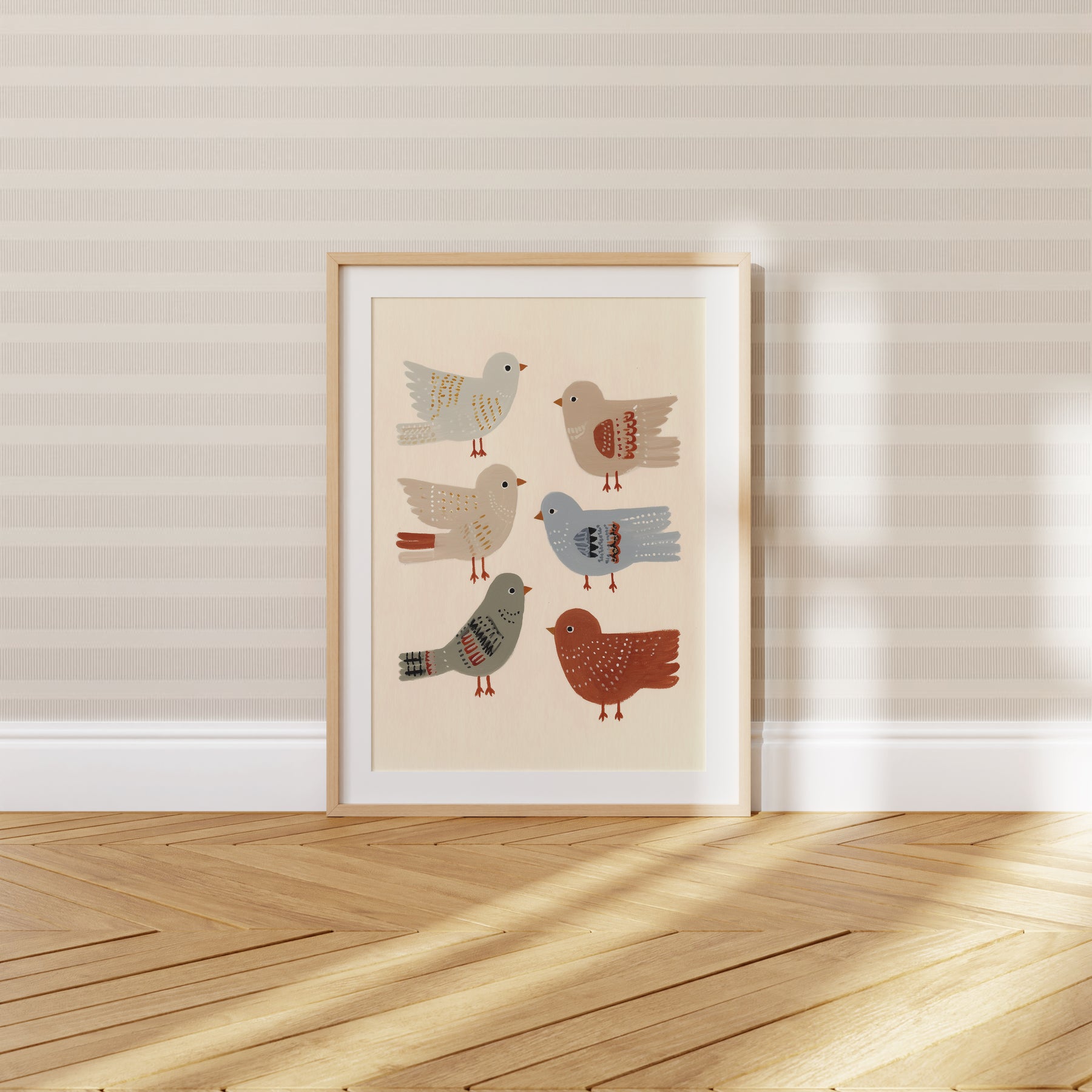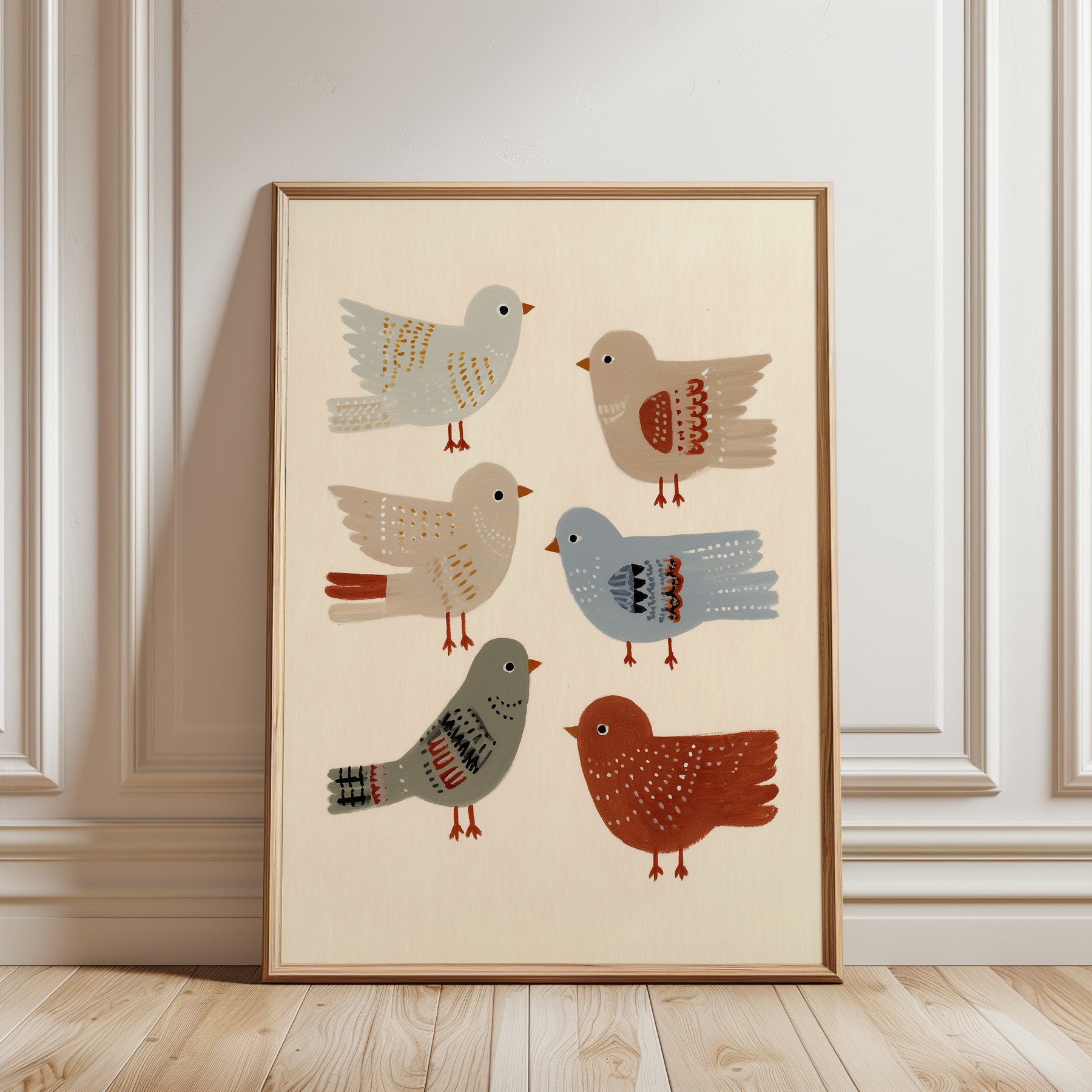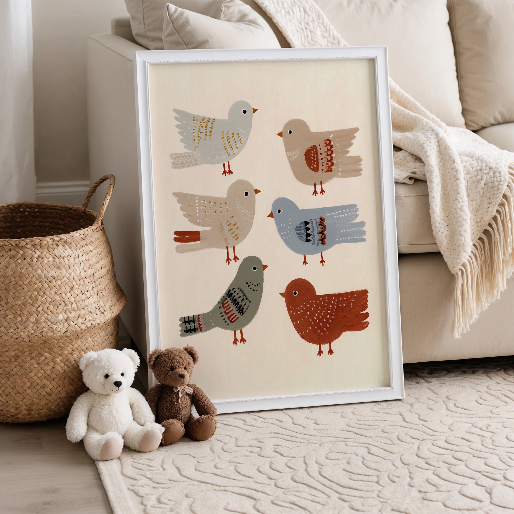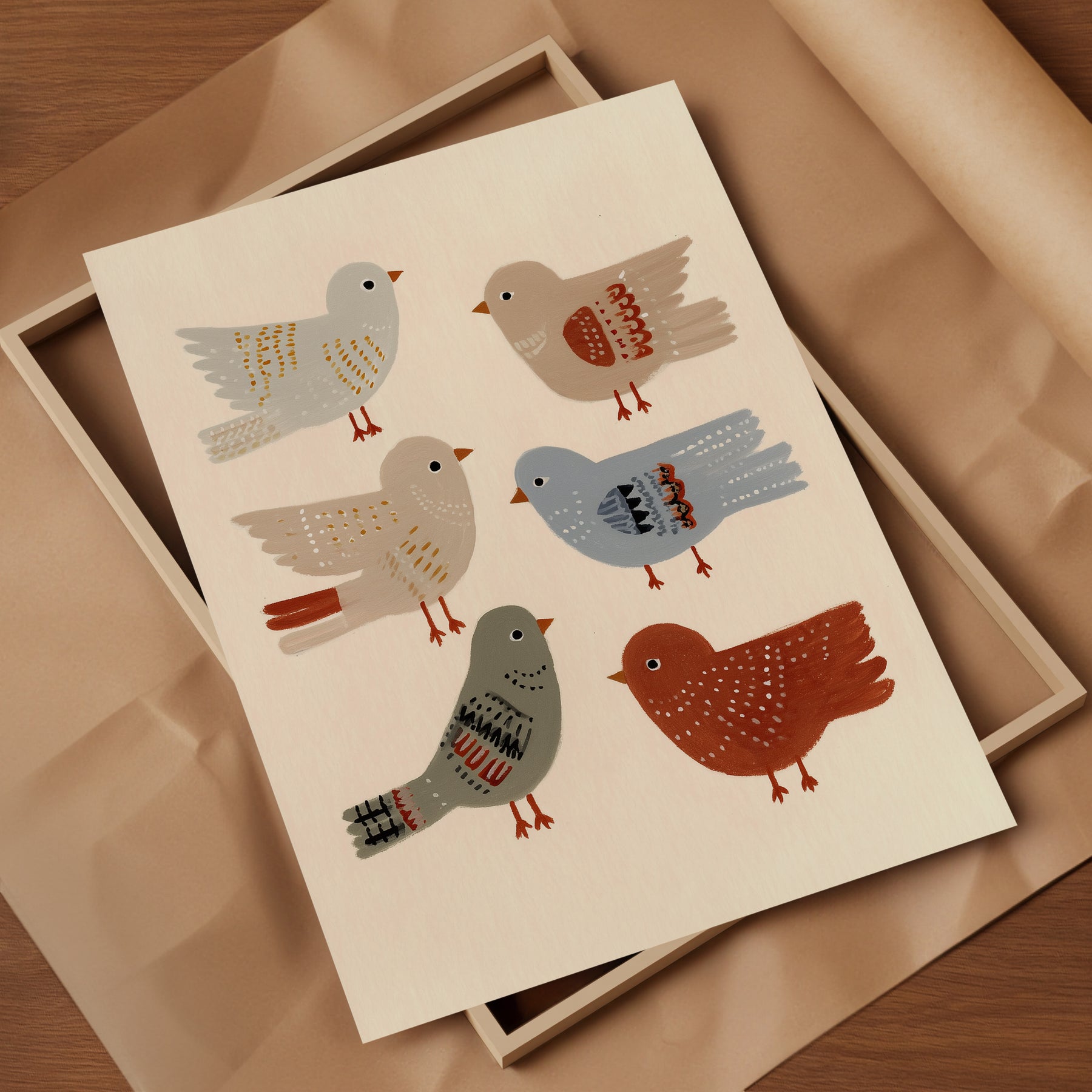 A cheerful flock of feathered friends in soft earthy tones. Birds of a Feather celebrates friendship and joy — a delightful print for nurseries, playrooms, or cozy corners filled with curiosity and charm.