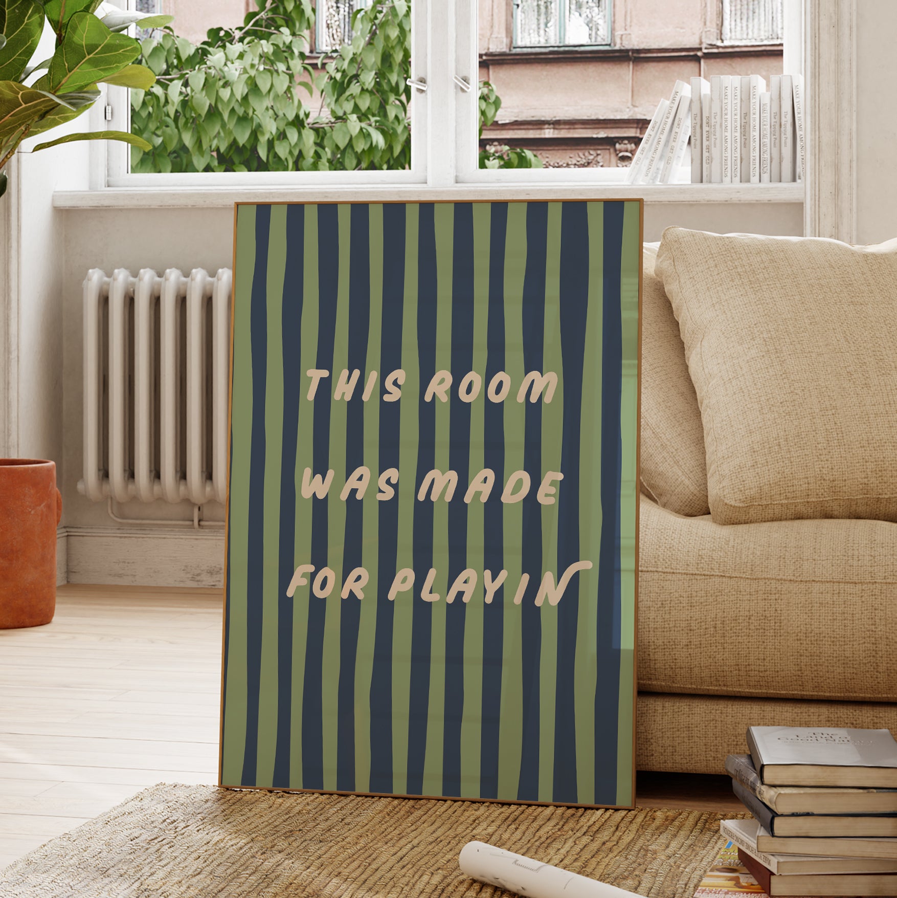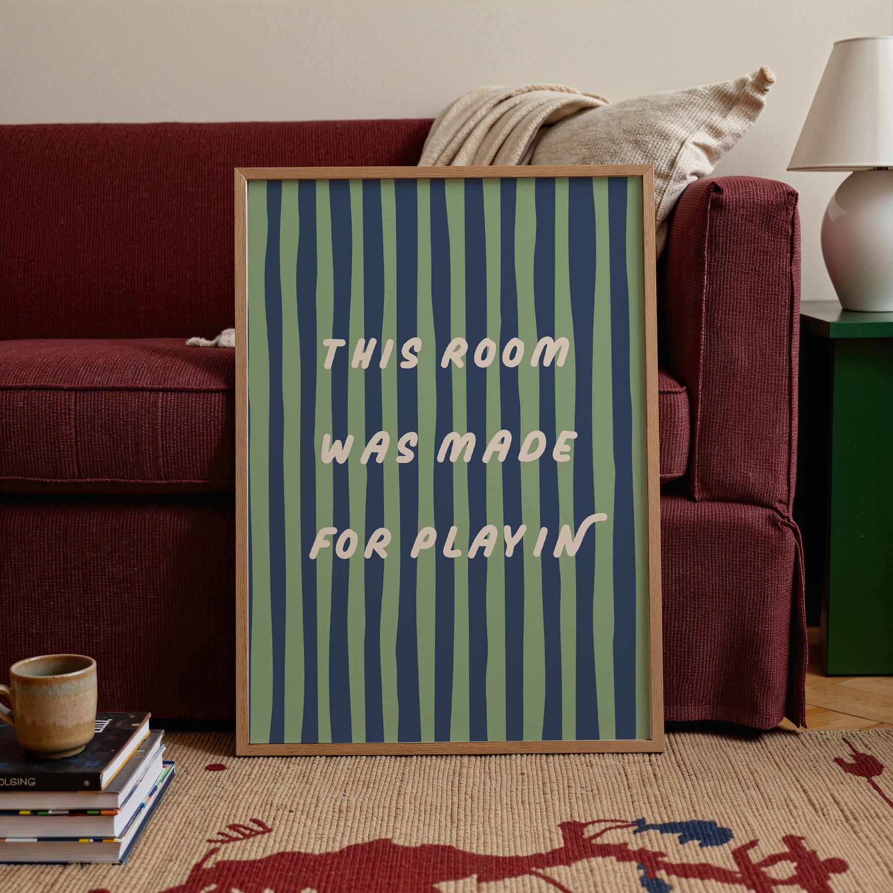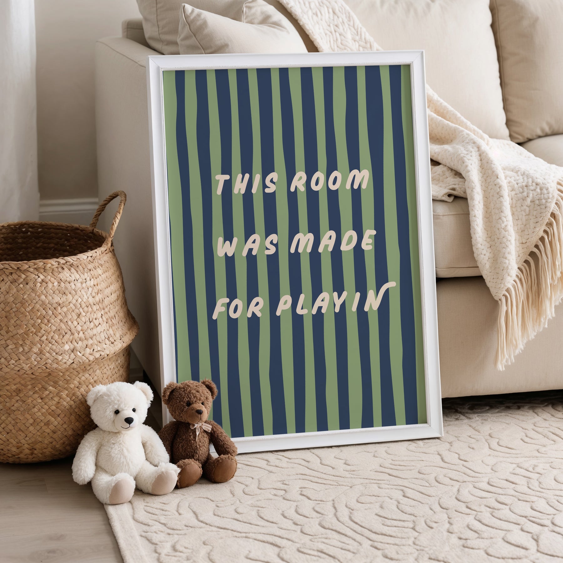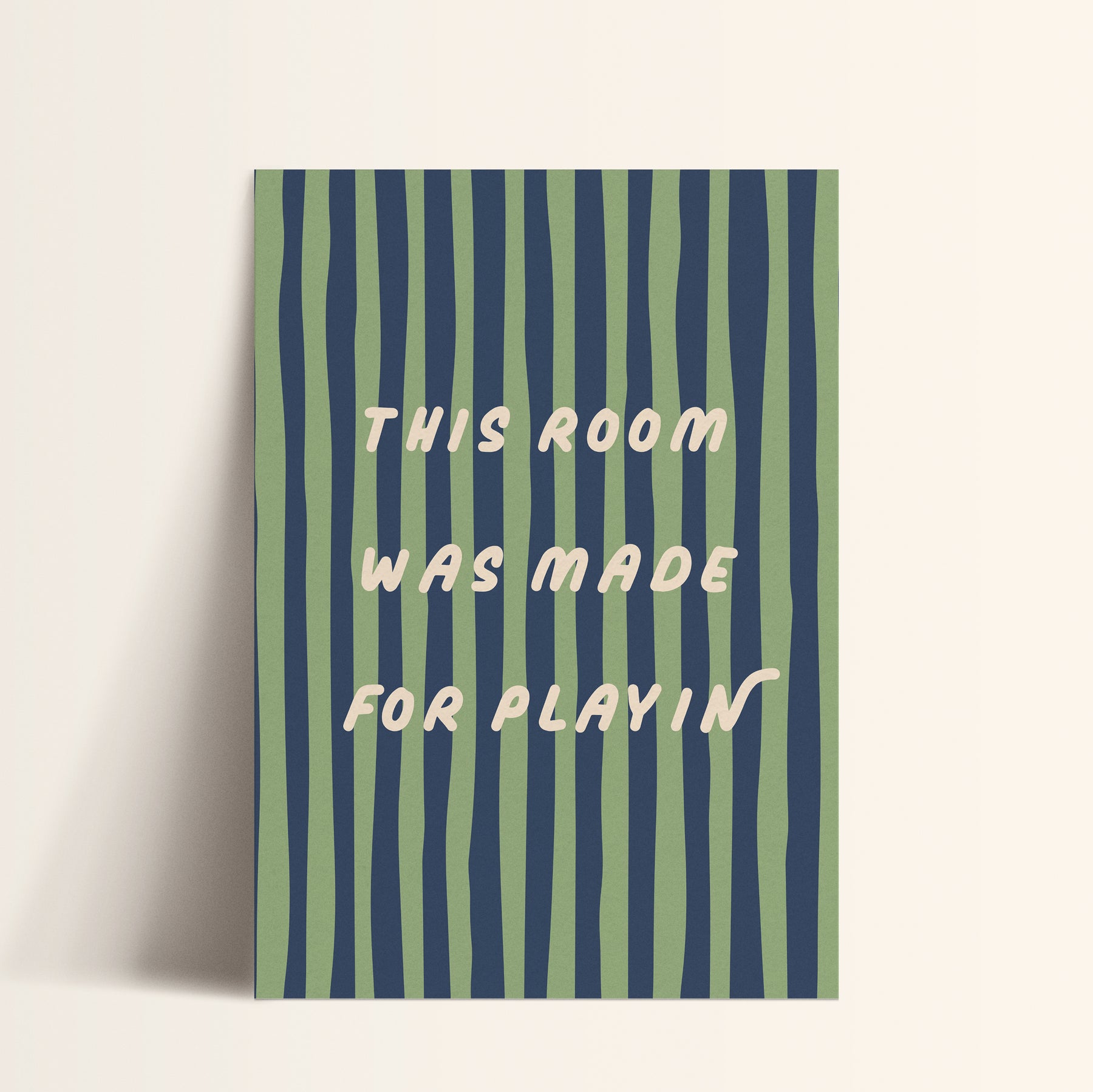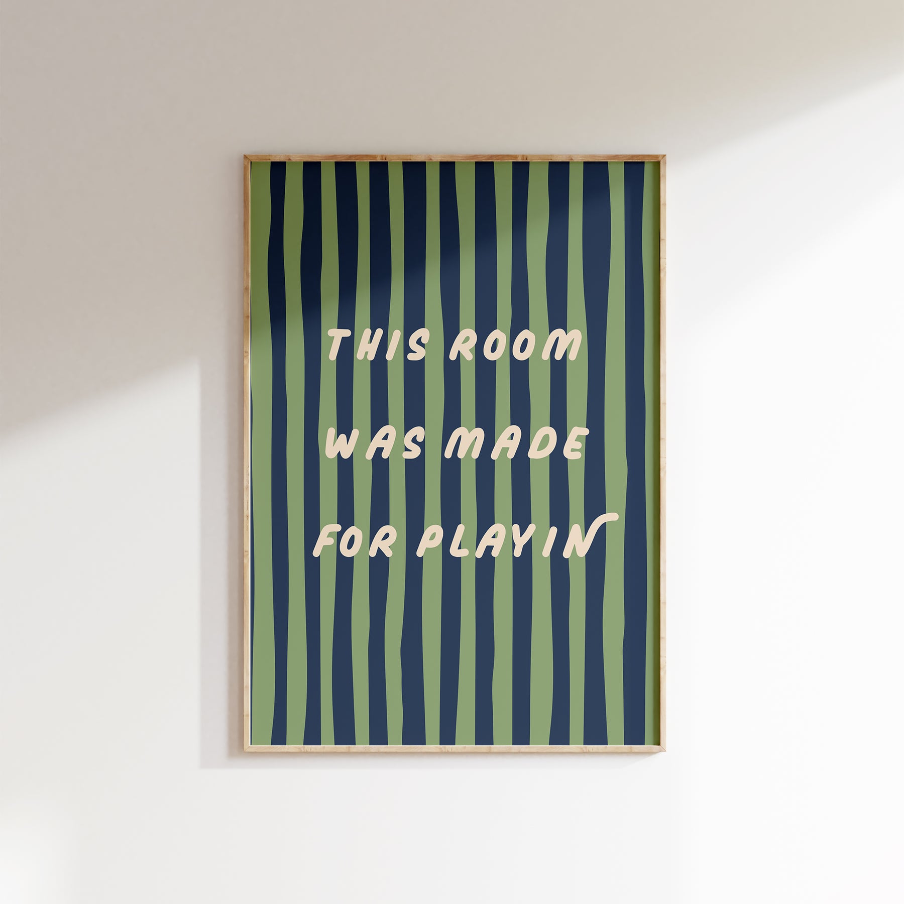 Bring energy and fun into your child’s space with this vibrant “This Room Was Made for Playin’” print. The bold wavy stripes and playful typography make it a perfect statement piece for active, imaginative little ones.