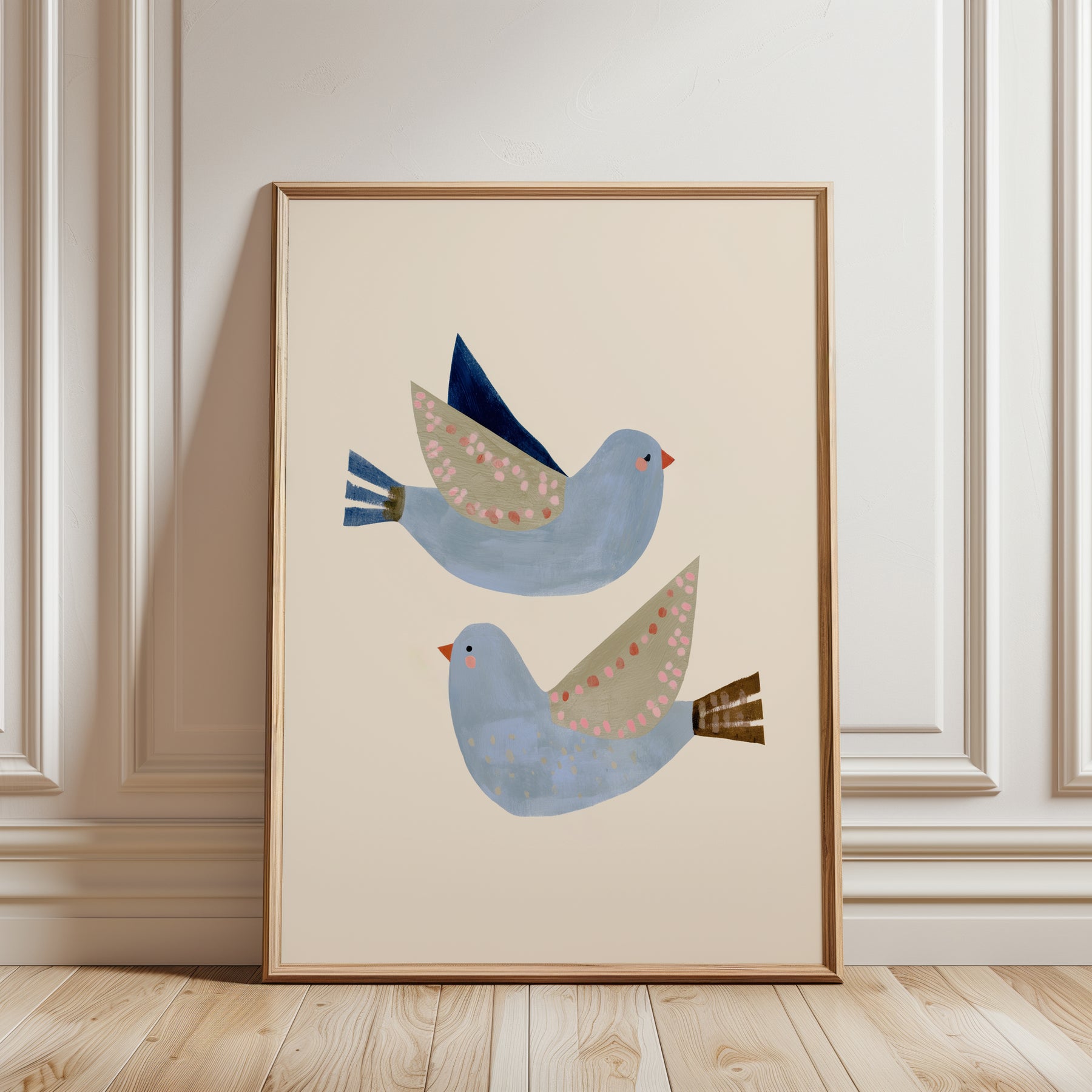 Create a serene atmosphere with this gentle blue flying birds print — perfect for establishing a calm nature-themed nursery space. This soothing illustration features two graceful blue doves in flight with decorative patterned wings in sage and coral on a soft neutral background, ideal for parents seeking peaceful bird nursery decor with modern illustrated tranquility and movement. What Makes This Flying Birds Print Special: • Hand-illustrated with elegant poses and detailed decorative wing patterns • Calming color palette in powder blue, sage, coral, navy, and cream perfect for peaceful nurseries • Gender-neutral serene design ideal for nature-loving and bird-themed kids rooms • Pairs beautifully with sky, nature, or Scandinavian-inspired nursery collections