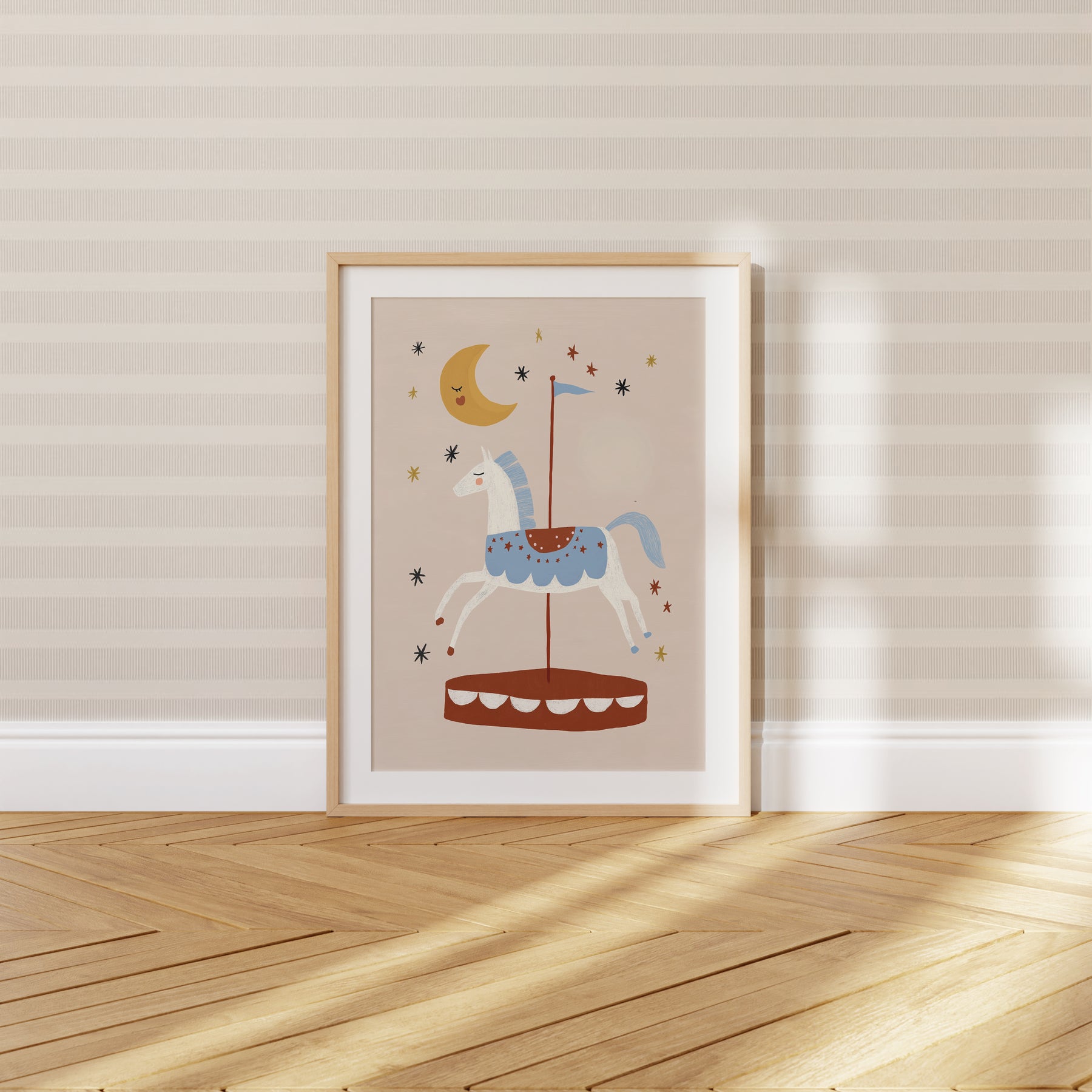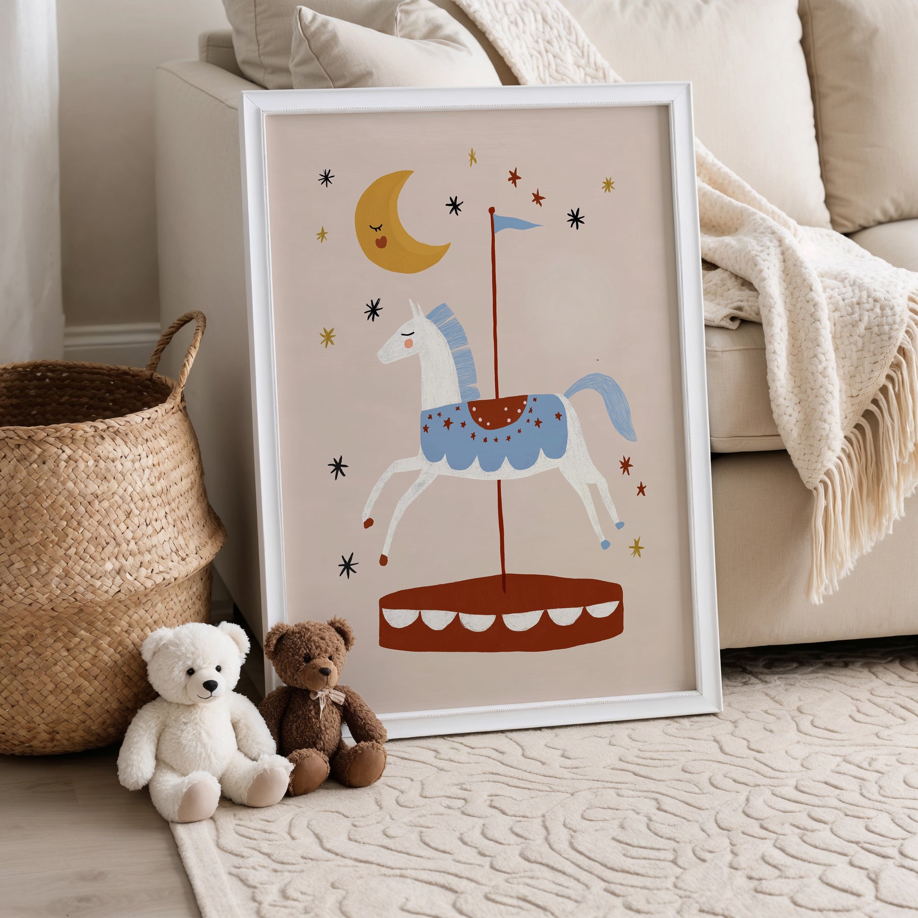 Capture carnival magic with this sweet carousel horse print — perfect for creating a nostalgic playful nursery atmosphere. This charming illustration features white carousel horse with powder blue mane, terracotta saddle, and star blanket on terracotta platform beneath golden moon and colorful stars on soft peachy cream background, ideal for parents seeking whimsical horse nursery decor with vintage carnival charm. What Makes This Carousel Horse Special: • Hand-illustrated with classic carousel details and festive decorative elements • Playful color palette in cream, powder blue, terracotta, golden yellow on peachy background perfect for joyful nurseries • Gender-neutral nostalgic design ideal for carousel and horse-loving kids rooms • Pairs beautifully with carnival, vintage toys, or celestial nursery collections