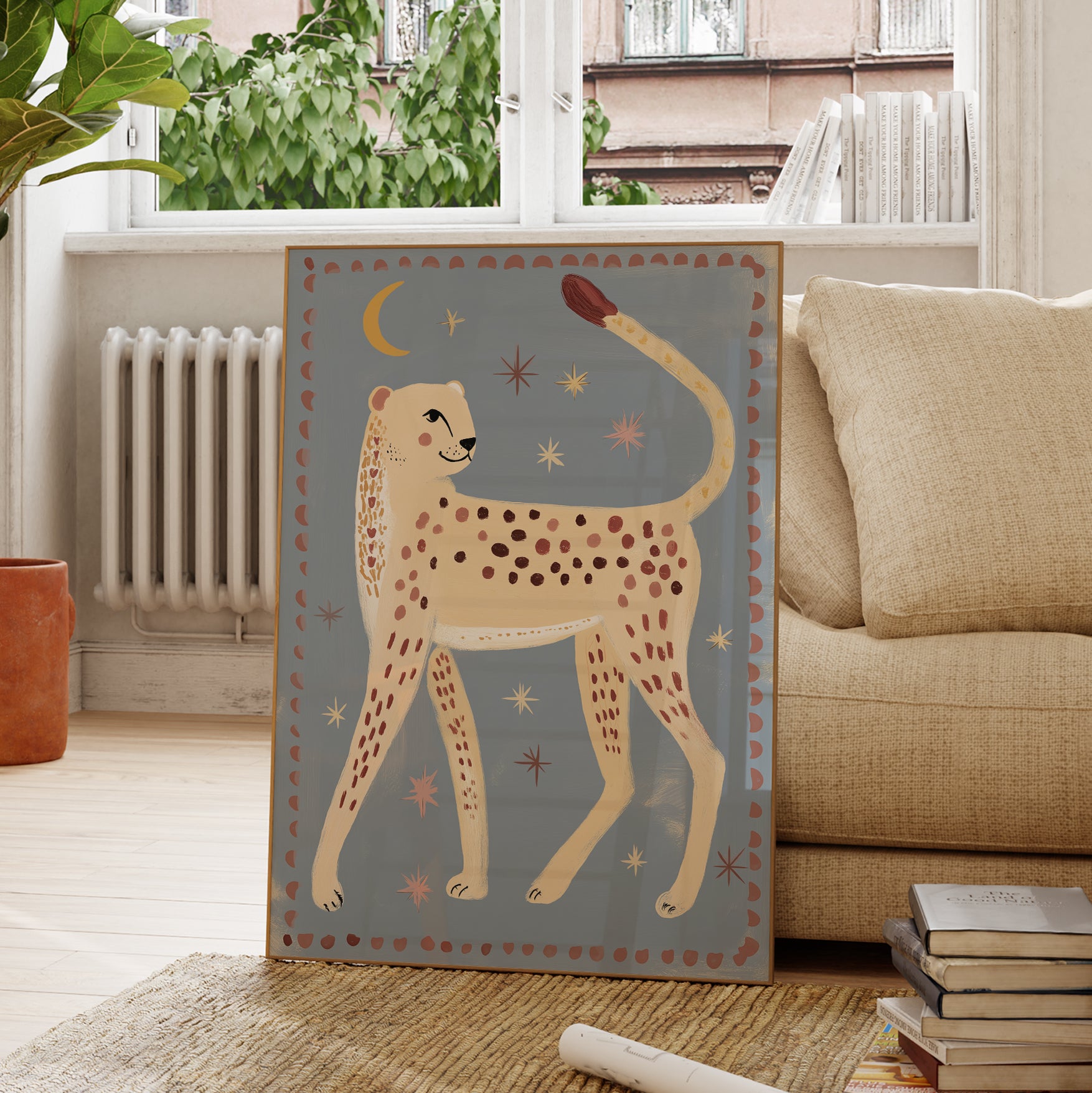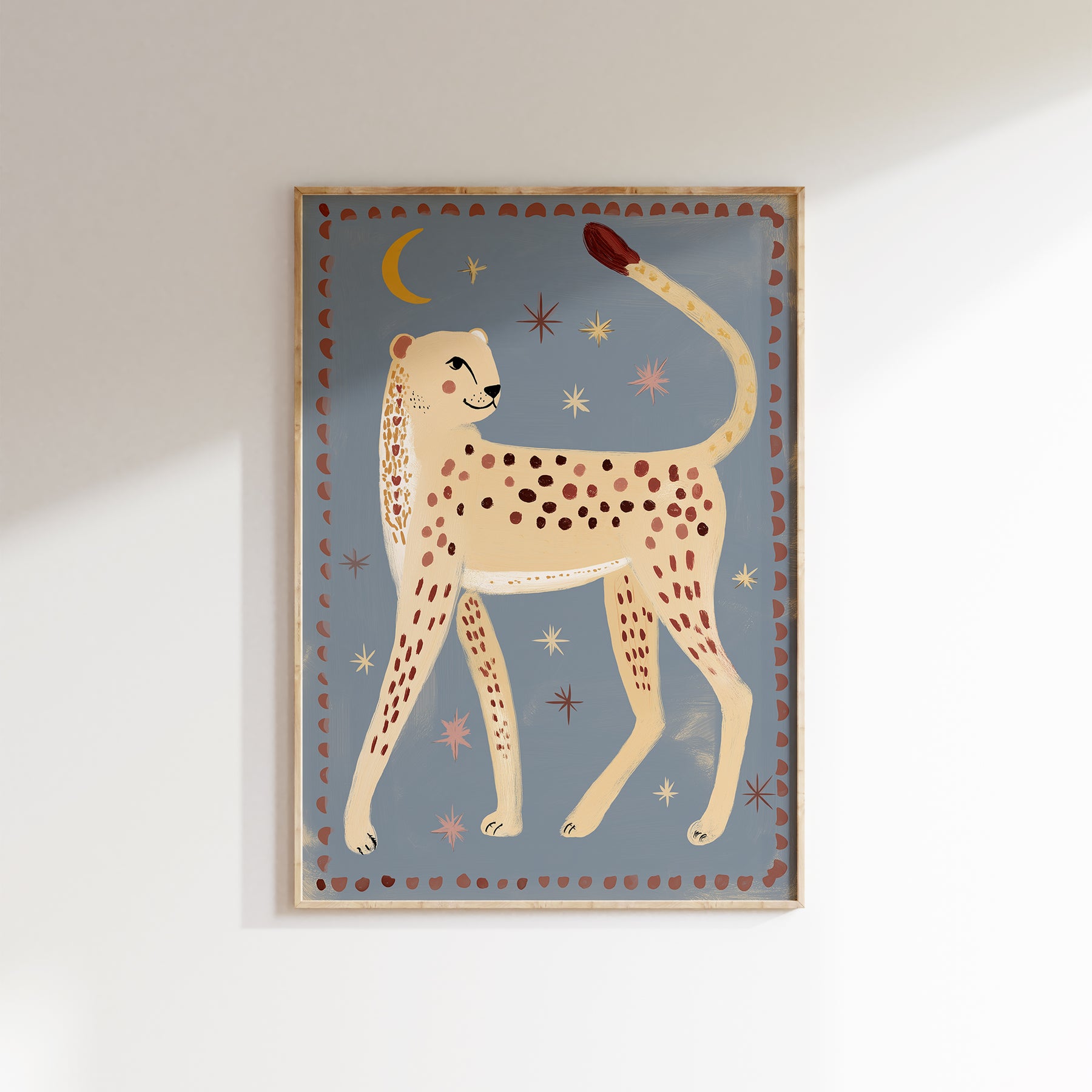 A graceful cream cheetah with rust-colored spots stands majestically against a slate blue sky filled with golden and coral stars, all framed by a charming scalloped border in terracotta tones. The elegant big cat with its distinctive tail held high creates a regal presence. This enchanting folk art piece brings sophisticated safari charm and celestial magic to nurseries with its vintage-inspired design and rich color palette.