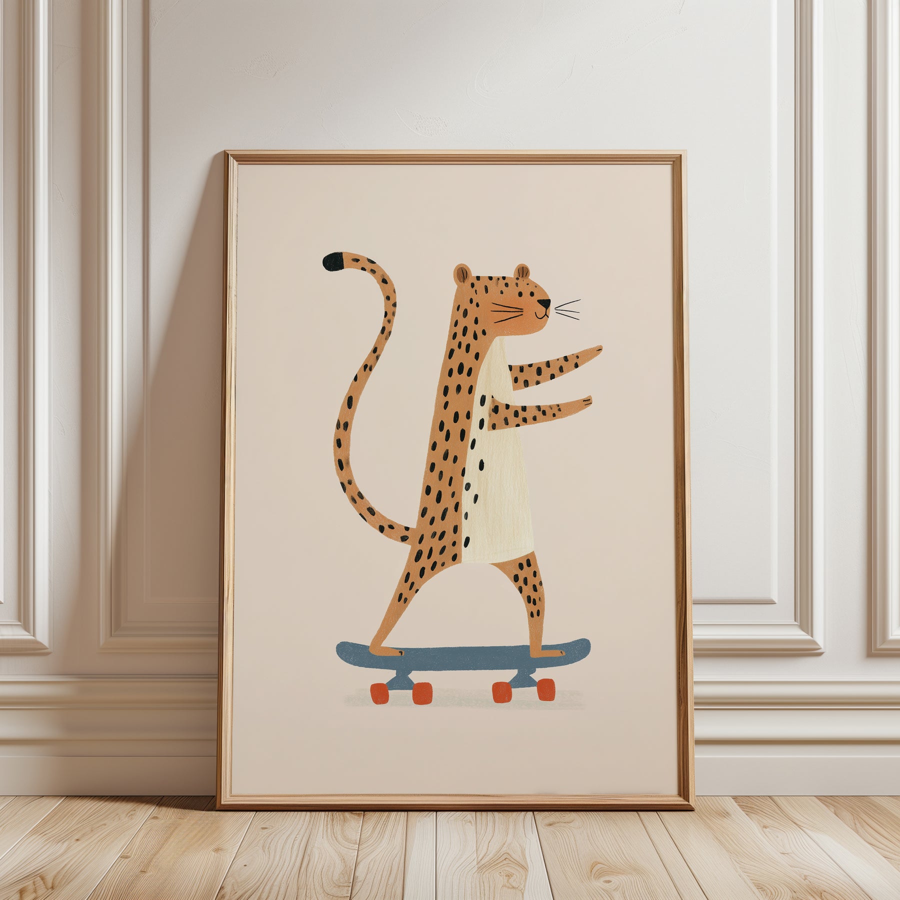 Add wild energy to your child's room with this dynamic cheetah on skateboard print — perfect for creating an adventurous safari-themed nursery atmosphere. This playful illustration features a spotted cheetah in minimal cream sweater riding a slate blue skateboard with coral wheels, ideal for parents seeking cool safari nursery decor with modern minimalist style and active movement. What Makes This Cheetah Print Special: • Hand-illustrated with detailed spot patterns and dynamic action pose • Clean color palette in golden tan, slate blue, coral, and cream perfect for modern nurseries • Gender-neutral active design ideal for safari and skateboard-loving kids rooms • Pairs beautifully with wild cat, jungle, or sports-themed nursery collections