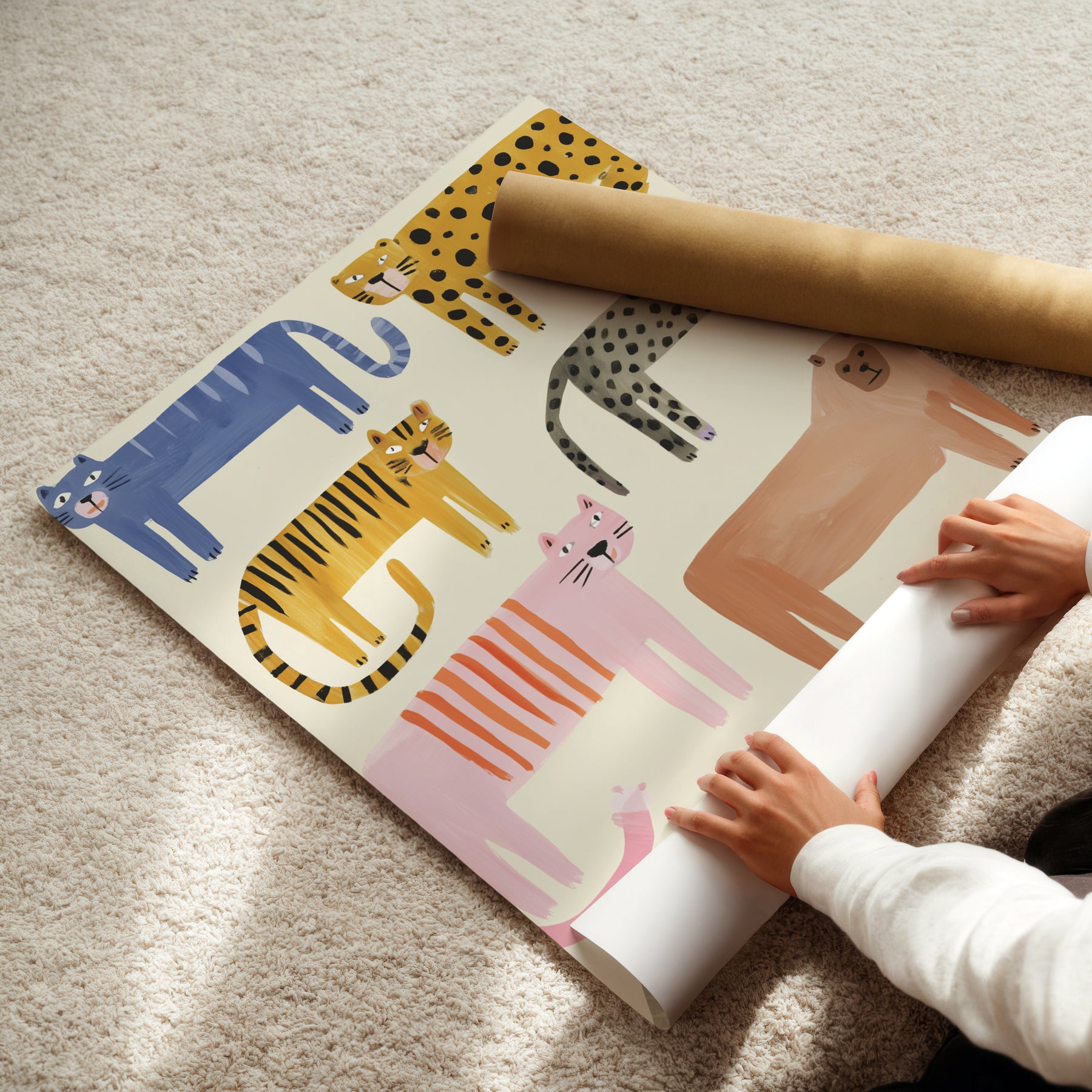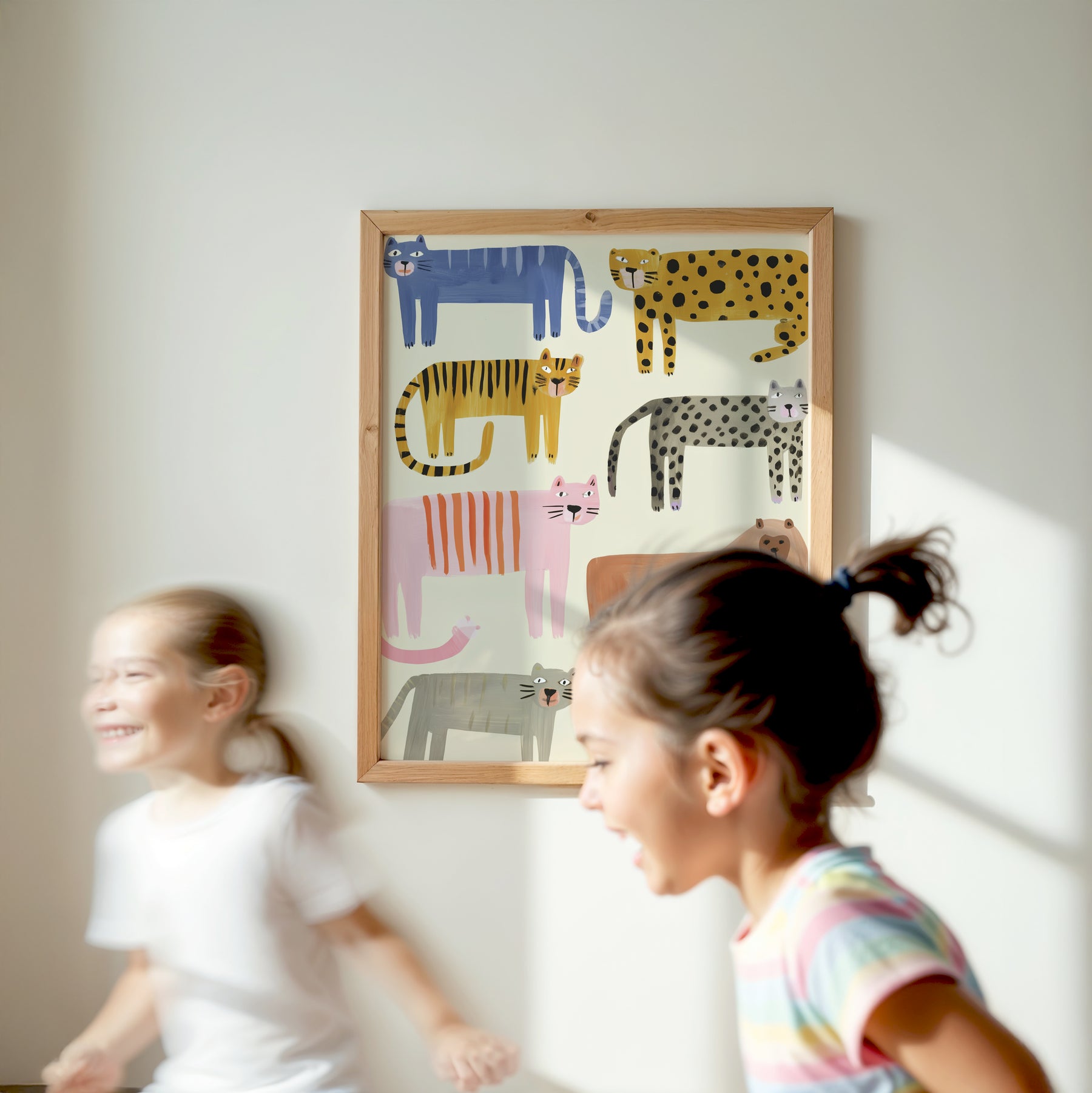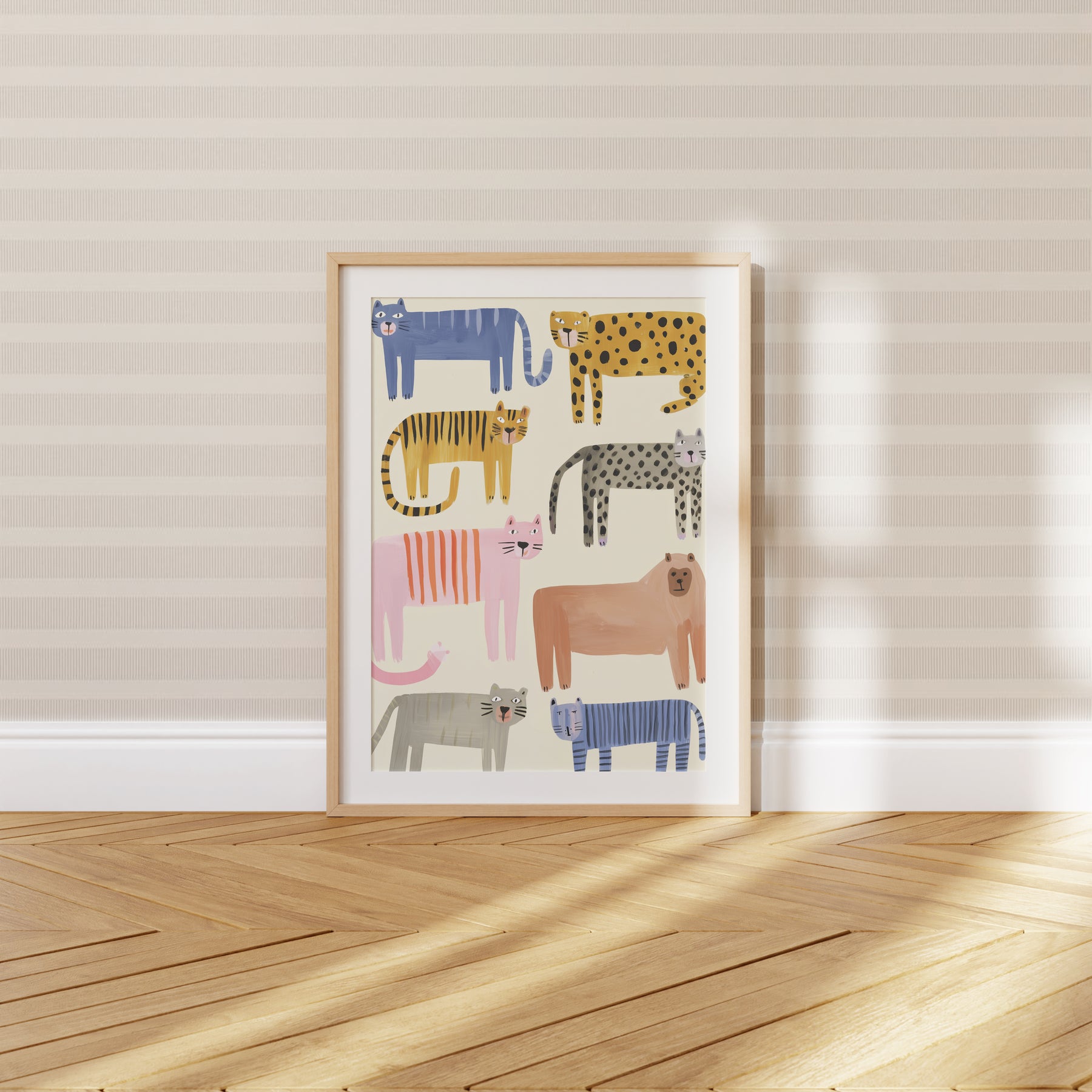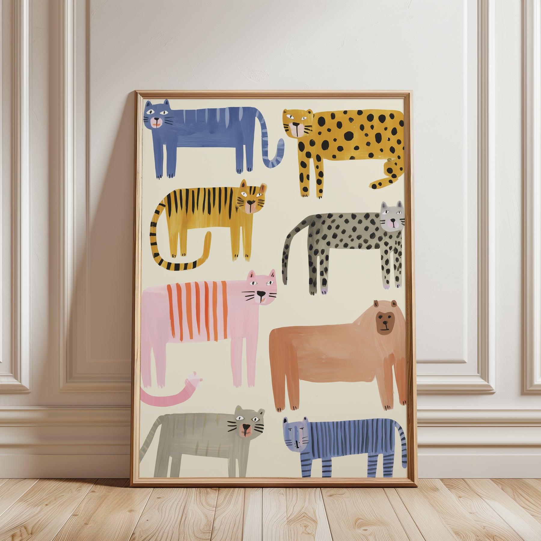 Eight playful wild cats parade across this delightful illustration, each featuring unique patterns and vibrant colors from navy stripes to golden spots, soft pink to warm terracotta. This charming collection includes leopards, tigers, and imaginative cat characters arranged in a whimsical composition that celebrates the beauty and diversity of wild felines. The hand-drawn style with bold patterns and sweet facial expressions creates an engaging, modern nursery piece. What Makes This Wild Cats Collection Special: • Hand-illustrated with eight distinct cat personalities and patterns • Vibrant rainbow palette including blue, pink, yellow, orange, and gray perfect for modern nurseries • Gender-neutral playful design ideal for safari-themed or animal-loving kids' rooms • Pairs beautifully with other animal collections and bold nursery themes