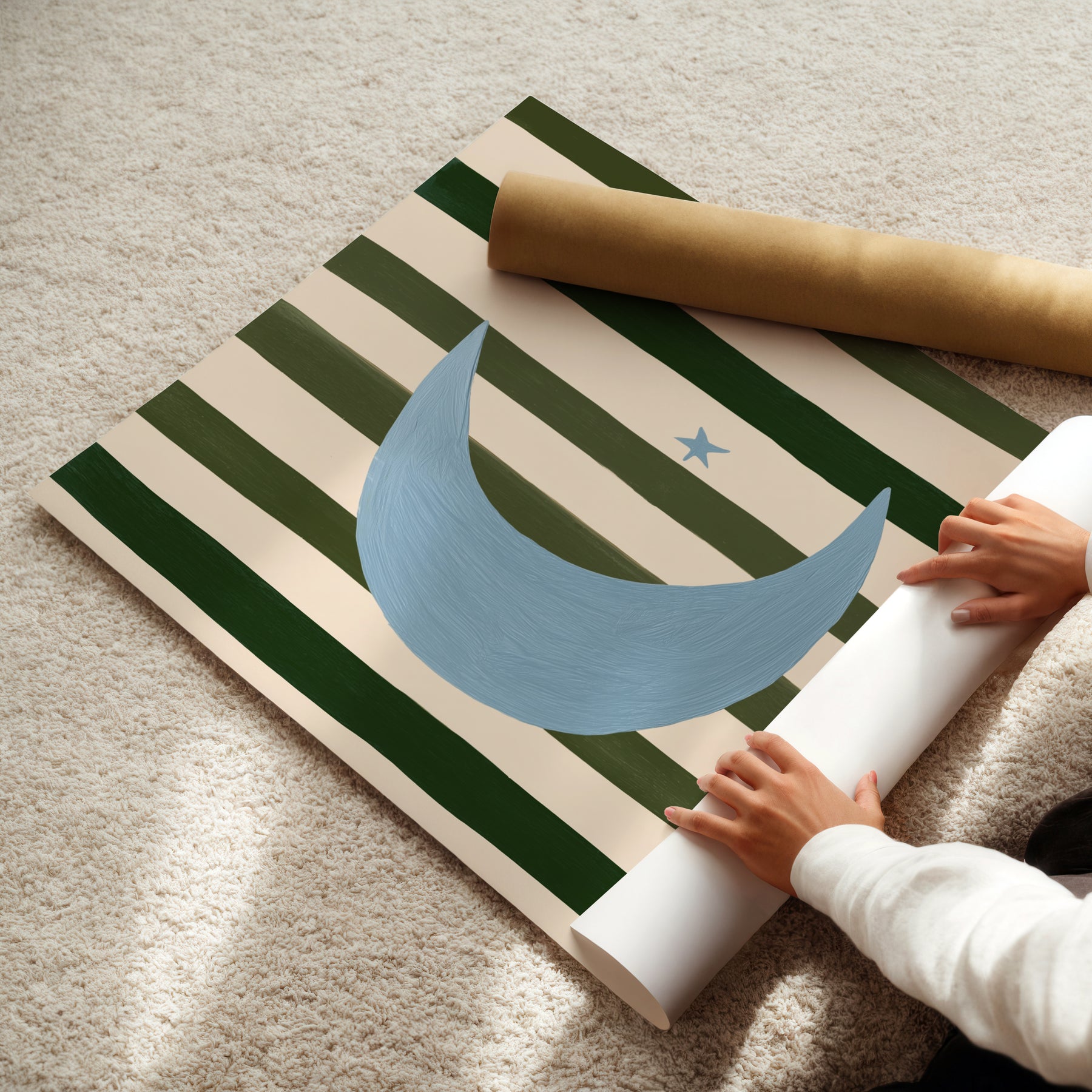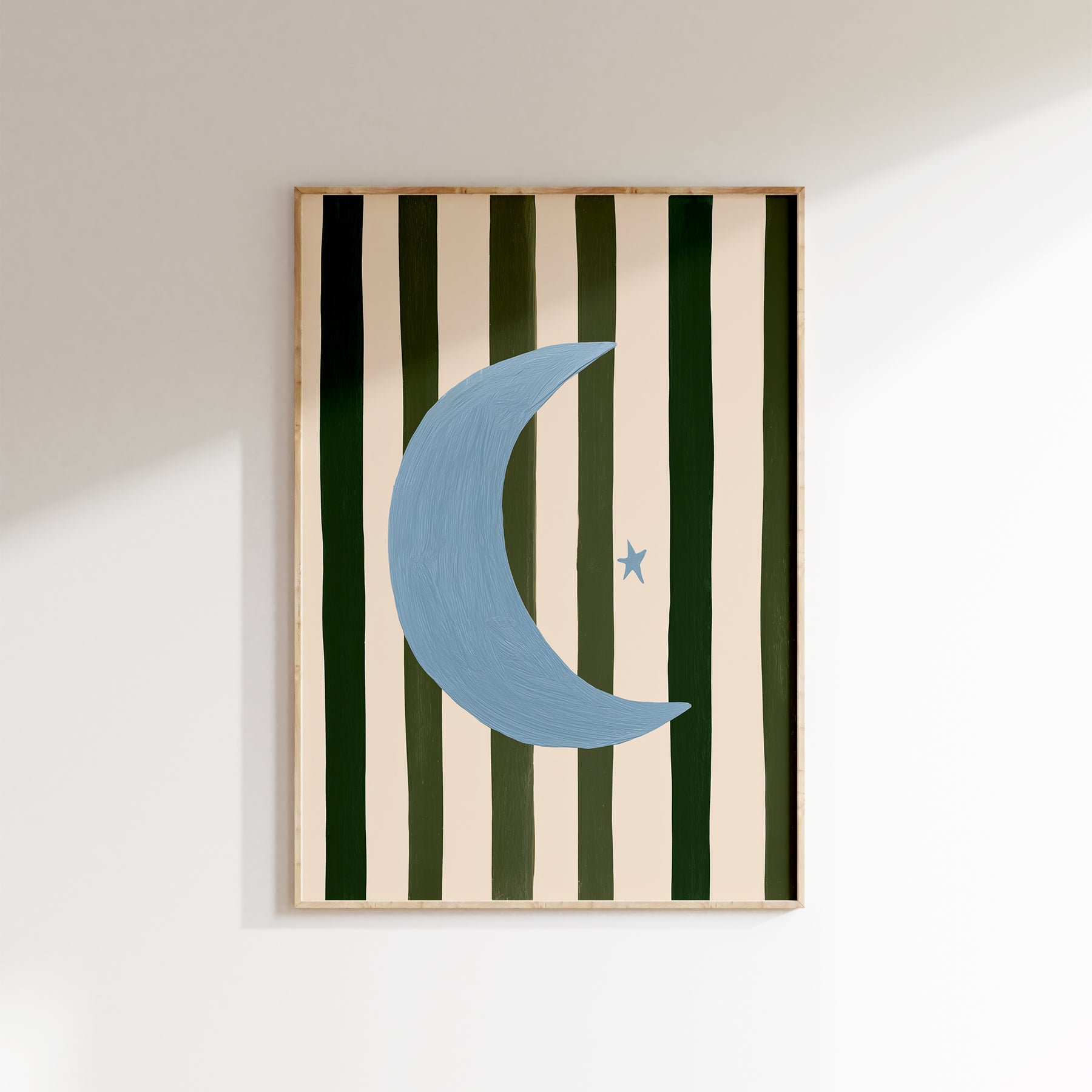 A serene blue crescent moon and delicate star float gracefully against bold forest green and cream vertical stripes, creating a striking modern celestial design. The textured brushstroke quality of both the stripes and moon adds artisanal charm to this contemporary composition. This bold yet calming piece brings sophisticated style to nurseries and children's rooms with its graphic pattern and peaceful nighttime imagery. What Makes This Crescent Moon Print Special: • Hand-illustrated with textured brushstrokes and modern graphic stripes • Bold forest green and cream palette perfect for sophisticated nurseries • Gender-neutral contemporary design ideal for modern or mid-century spaces • Pairs beautifully with other geometric patterns and celestial themes