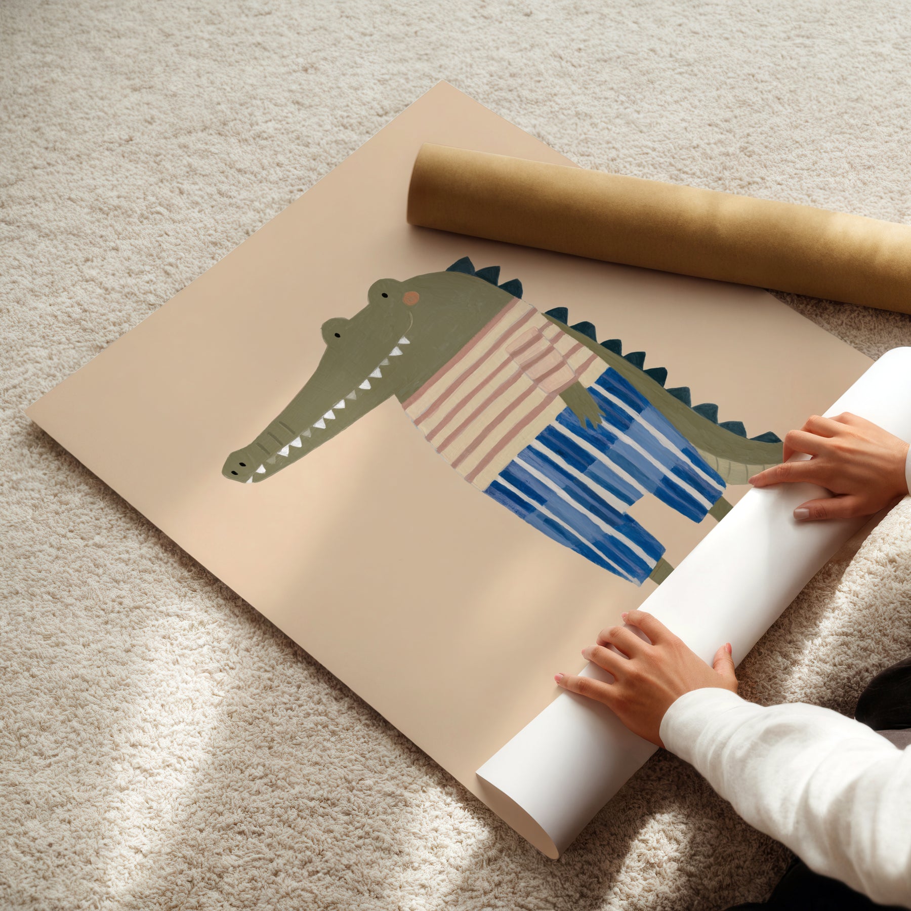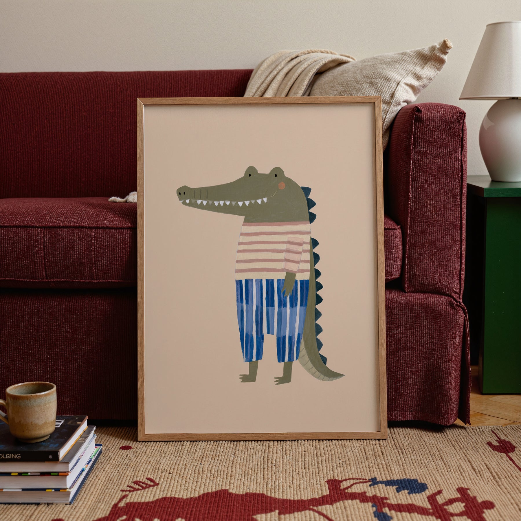 Add playful character to your child's space with this friendly crocodile print — perfect for creating a fun safari-themed nursery atmosphere. This charming illustration features a smiling crocodile wearing pink and cream striped shirt and blue striped pants with navy spikes on a warm peachy background, ideal for parents seeking unique safari nursery decor with a gentle, illustrated approach. What Makes This Crocodile Print Special: • Hand-illustrated with friendly expression and bold striped patterns • Cheerful color palette in sage green, pink, navy, blue, and peach perfect for vibrant nurseries • Gender-neutral safari design ideal for playful modern kids rooms • Pairs beautifully with jungle, safari, or pattern-loving nursery collections