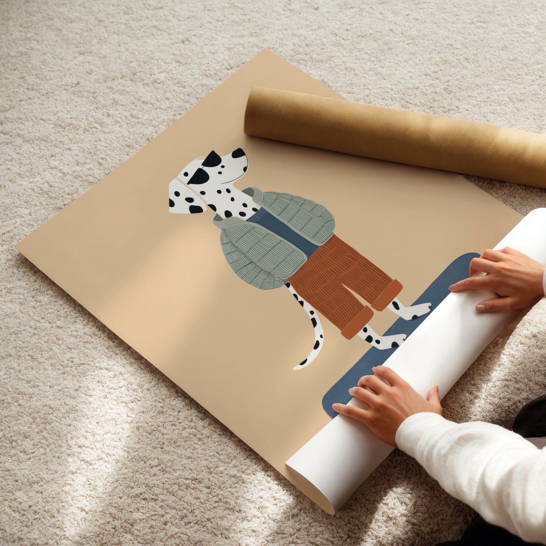 Bring playful style to your child's space with this adorable dalmatian on skateboard print — perfect for creating a fun dog-themed nursery atmosphere. This charming illustration features a friendly spotted dalmatian wearing sage green jacket and terracotta corduroy pants on a slate skateboard, ideal for parents seeking cool dog nursery decor with modern illustrated appeal and active energy. What Makes This Dalmatian Print Special: • Hand-illustrated with detailed spots and textured clothing patterns • Earthy color palette in sage green, terracotta, slate blue, and cream perfect for modern nurseries • Gender-neutral active design ideal for dog-loving and skateboard-themed kids rooms • Pairs beautifully with puppy, pet, or sports nursery collections