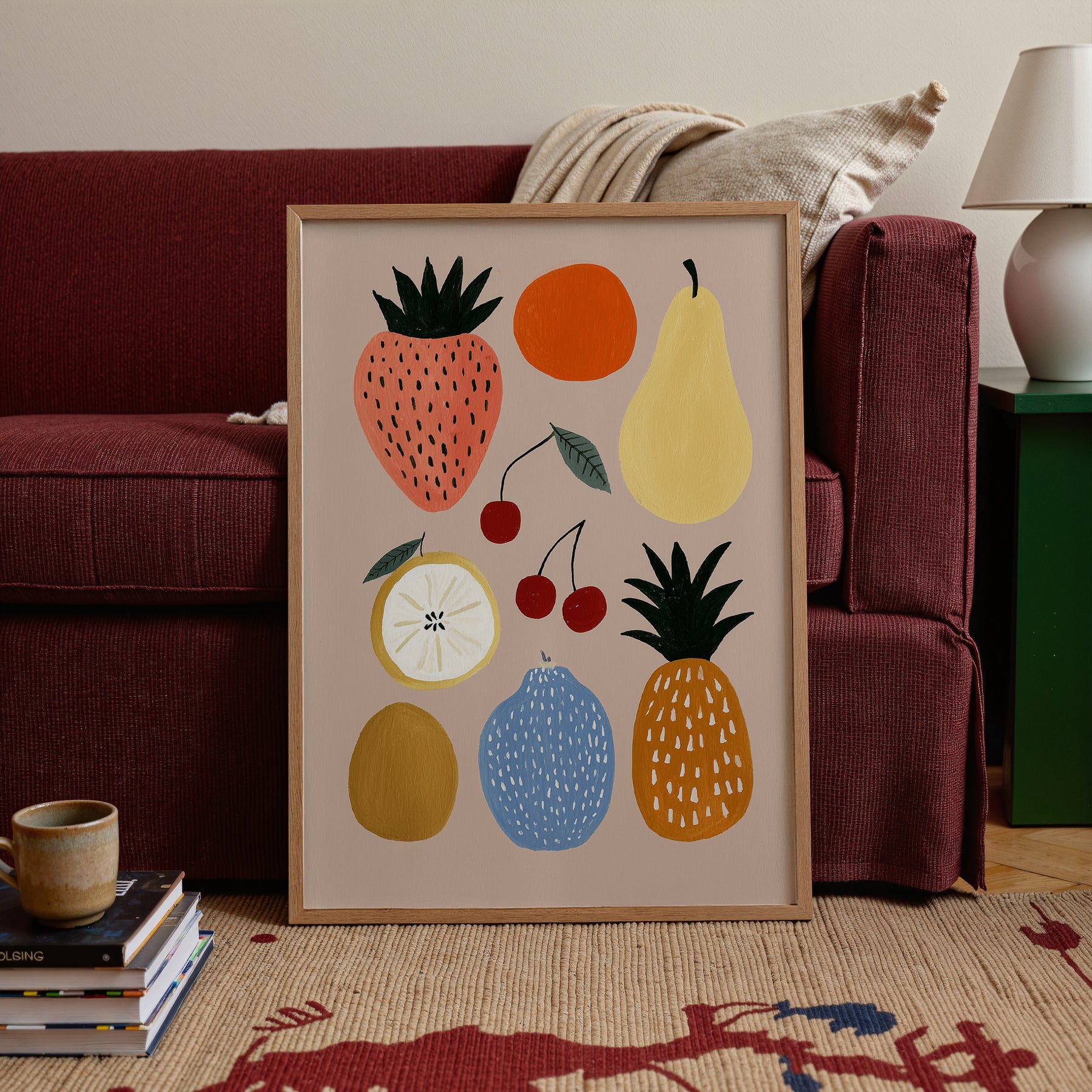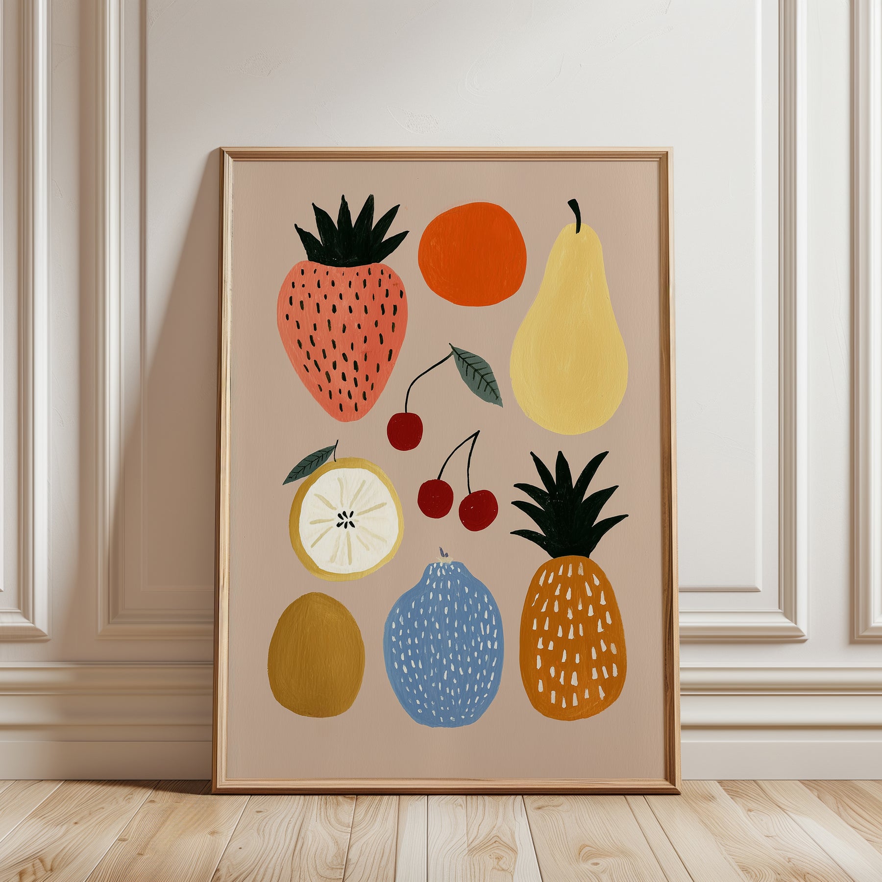A delightful arrangement of colorful fruits dances across a soft pink background - featuring a textured strawberry with black seeds, vibrant pineapples, a yellow pear, sunny orange, red cherries, a sliced lemon, and varied tropical fruits in cheerful blues and golds. Each fruit is illustrated with charming hand-drawn details and playful patterns. This fresh, modern design brings a sweet, healthy vibe to nurseries and playrooms with its approachable, friendly fruit characters. What Makes This Fruit Collection Special: • Hand-illustrated with textured details and playful fruit arrangement • Warm pink background with vibrant multi-colored fruits perfect for cheerful nurseries • Gender-neutral fresh design ideal for kitchen-inspired or healthy-living themed spaces • Pairs beautifully with other food illustrations and botanical prints