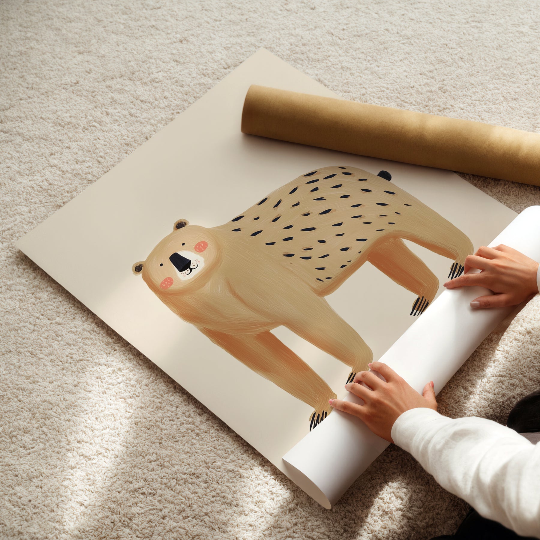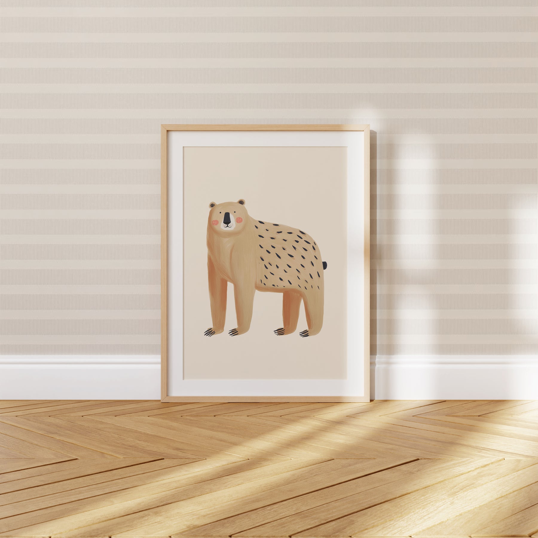 A sweet honey-colored bear with rosy cheeks and textured brushstroke patterns gazes peacefully from a clean cream background, creating a minimalist yet charming nursery focal point. The bear's gentle expression and hand-illustrated details including delicate dash patterns on its back bring warmth and personality to this simple composition. This understated design works beautifully in Scandinavian, modern, or nature-inspired nurseries. What Makes This Gentle Bear Special: • Hand-illustrated with subtle textured brushstrokes and minimal composition • Warm honey and cream palette perfect for neutral, calming nurseries • Gender-neutral woodland design ideal for Scandinavian or minimalist spaces • Pairs beautifully with other simple animal portraits and nature themes
