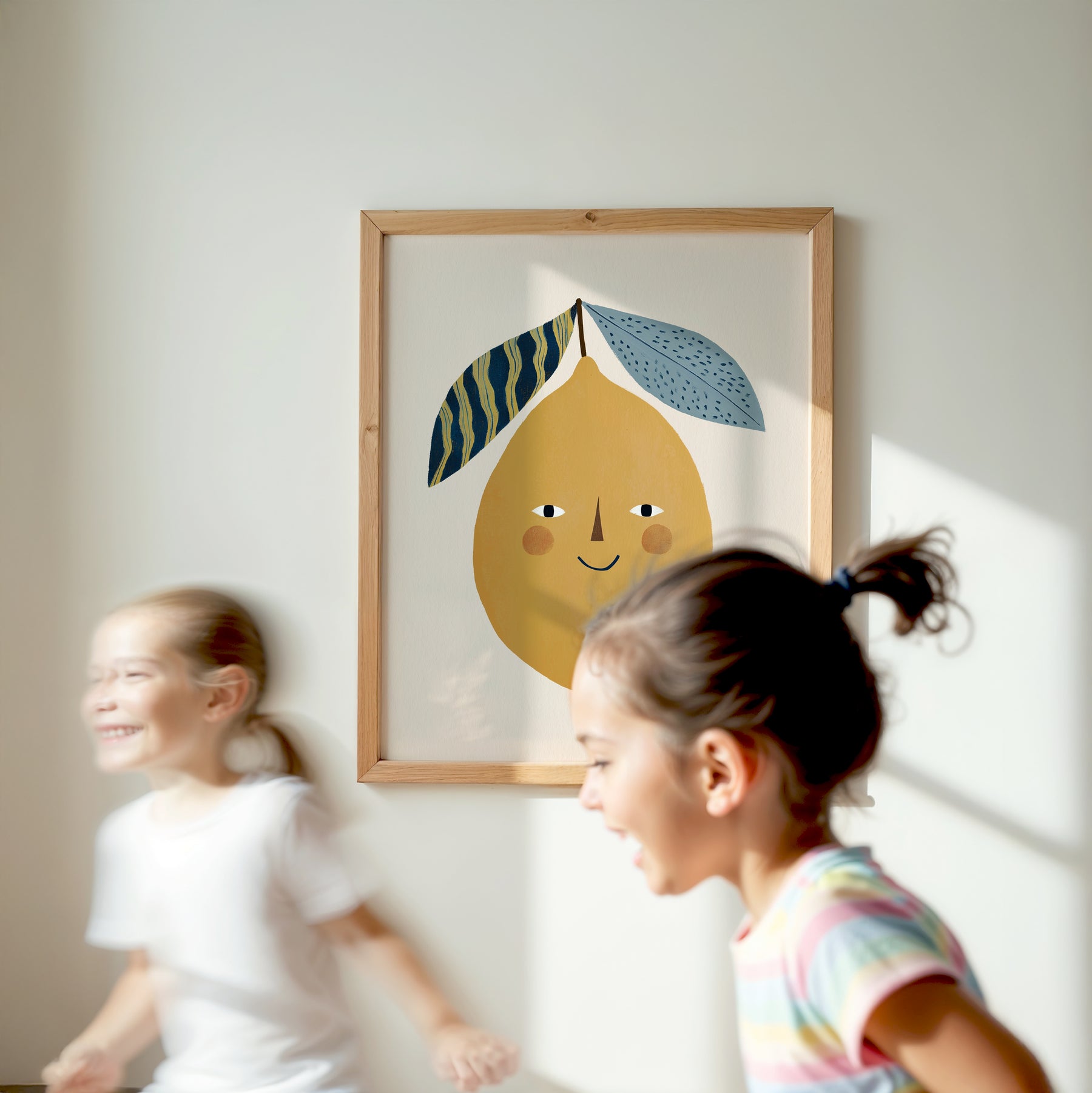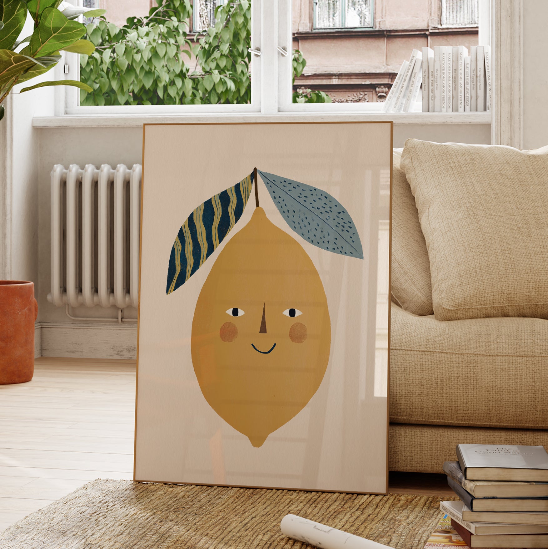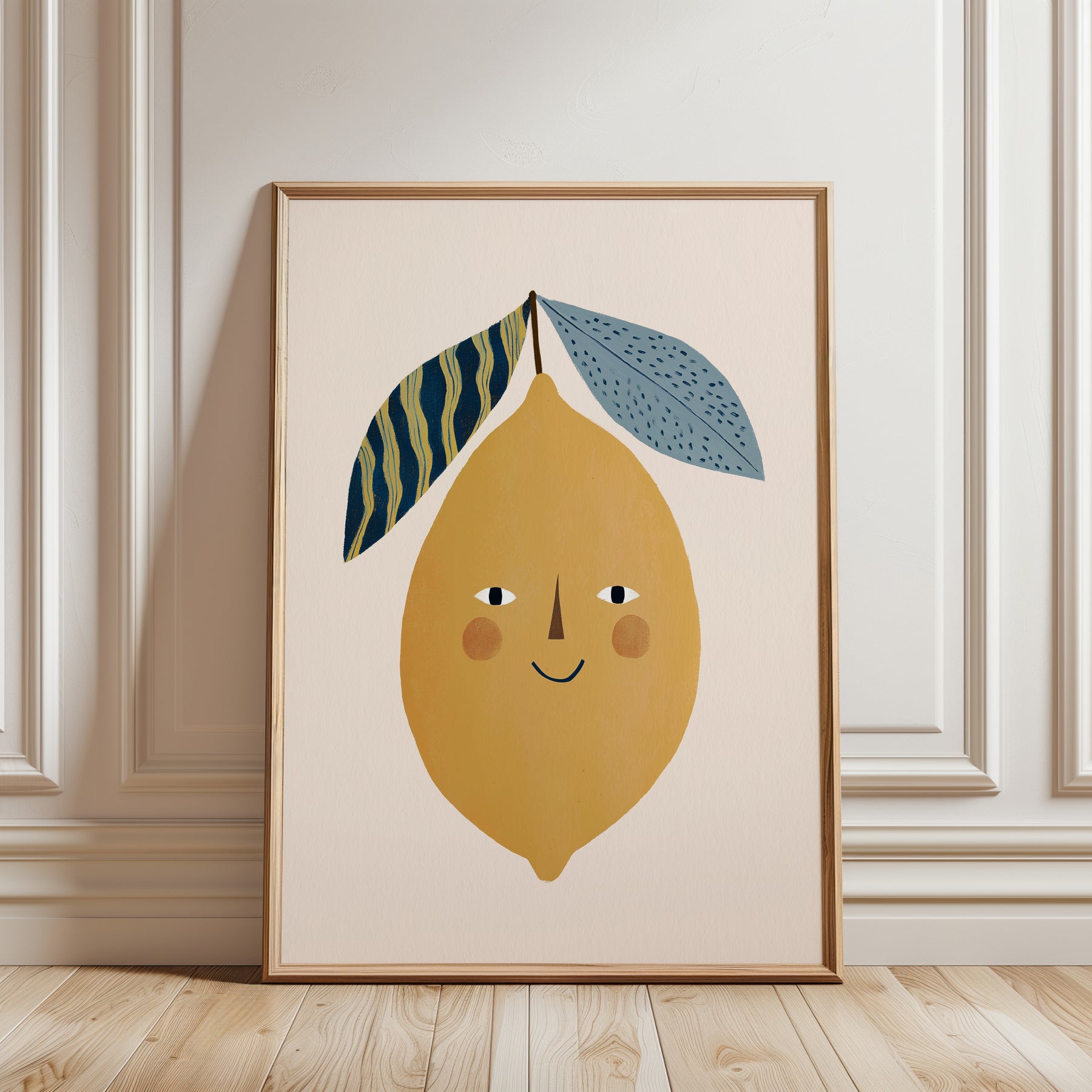 Fill your child's room with sunshine and smiles through this delightful happy lemon print — perfect for creating a bright, uplifting nursery atmosphere. This charming illustration features a sweet lemon character with decorative patterned leaves in navy and slate blue on a soft neutral background, ideal for parents seeking cheerful fruit nursery decor with a modern illustrated touch. What Makes This Happy Lemon Print Special: • Hand-illustrated with endearing facial features and intricate leaf patterns • Sunny color palette in golden yellow, navy, slate blue, and warm neutrals perfect for cheerful spaces • Gender-neutral kawaii-style design ideal for playful modern nurseries • Pairs beautifully with citrus-themed, kitchen, or botanical nursery collections