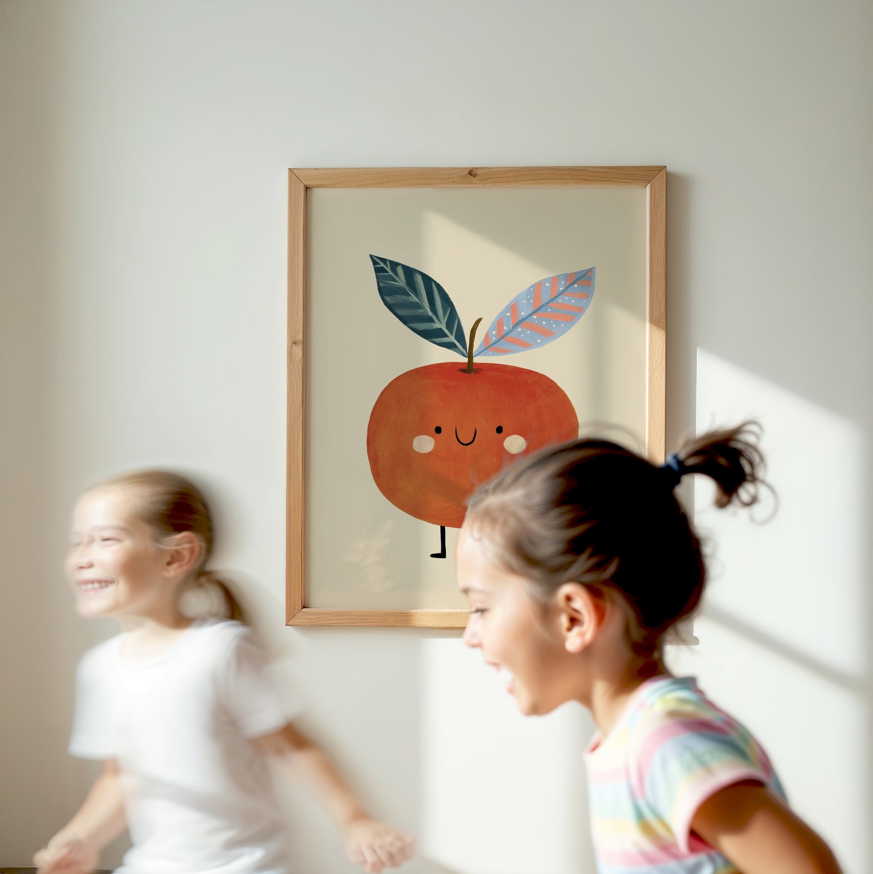 Brighten your child's space with this adorable happy oraapplege print — perfect for creating a cheerful, positive nursery atmosphere. This sweet illustration features a smiling apple character with decorative leaves in teal and coral on a warm cream background, ideal for parents seeking cute fruit nursery decor that brings joy and whimsy to children's rooms. What Makes This Happy Apple Print Special: • Hand-illustrated with charming facial expression and detailed botanical elements • Cheerful color palette in coral orange, teal, slate blue, and cream perfect for bright nurseries • Gender-neutral kawaii-style design ideal for playful kids room decor • Pairs beautifully with fruit-themed, kitchen, or nature-inspired nursery collections