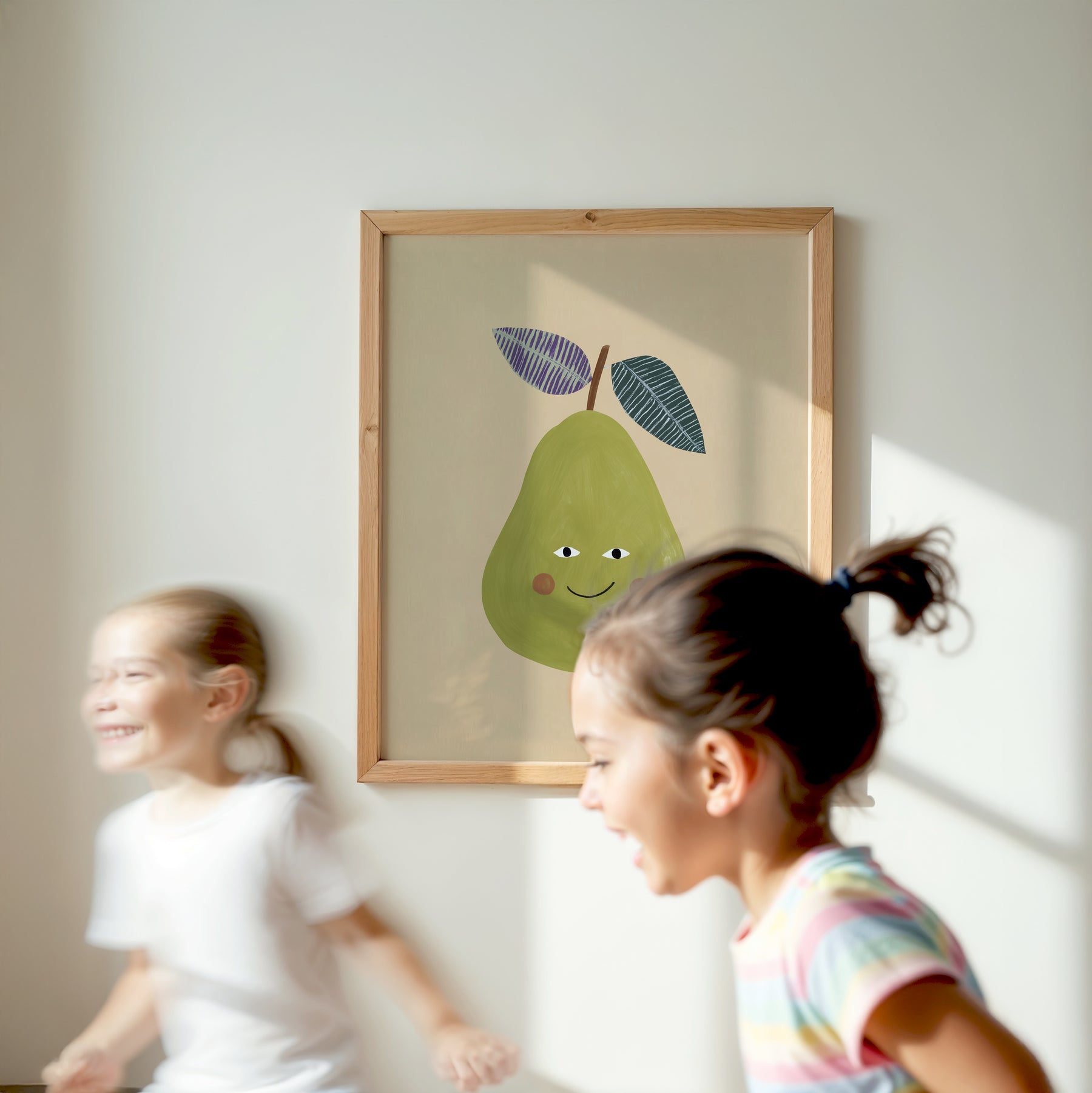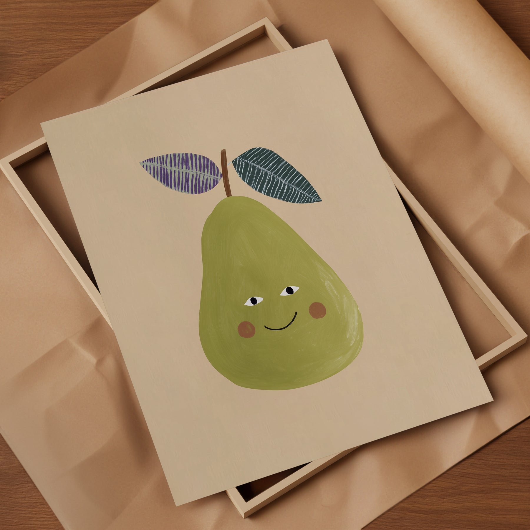 Add kitchen garden sweetness with this adorable happy pear print — perfect for creating a cheerful food-themed nursery atmosphere. This charming illustration features a smiling green pear with rosy cheeks and decorative navy and sage striped leaves on soft cream background, ideal for parents seeking playful fruit nursery decor with modern illustrated botanical charm and kawaii appeal. What Makes This Happy Pear Special: • Hand-illustrated with sweet facial expression and detailed patterned leaves • Fresh color palette in sage green, navy, terracotta, and cream perfect for natural nurseries • Gender-neutral playful design ideal for kitchen, garden, or food-loving kids rooms • Pairs beautifully with farmer's market, fruit collection, or botanical nursery collections