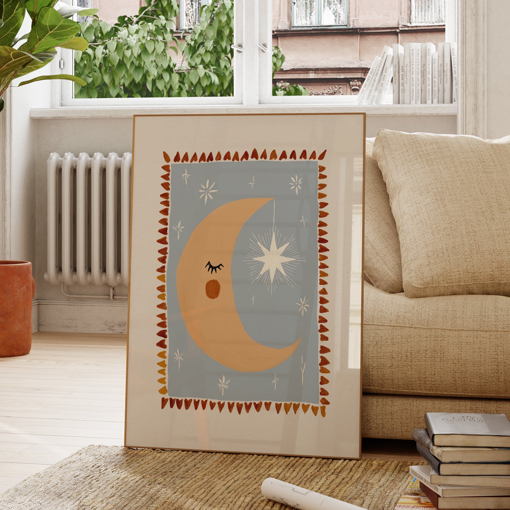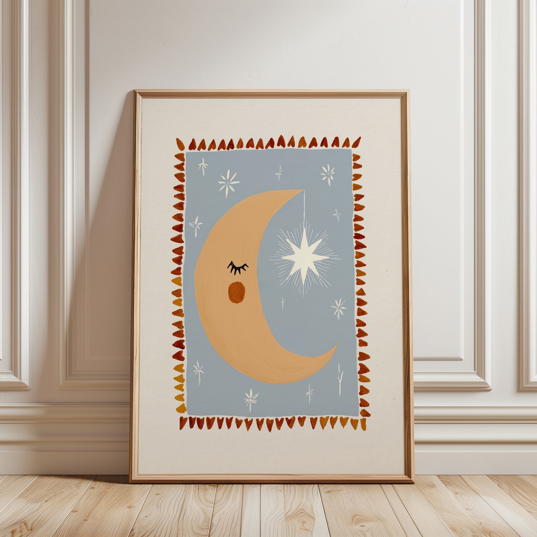 Create nighttime magic with this elegant moon and star border print — perfect for establishing a serene celestial nursery atmosphere. This beautiful illustration features peachy crescent moon with rosy cheeks and brilliant white star on soft blue-grey sky surrounded by terracotta decorative border, ideal for parents seeking sophisticated celestial nursery decor with folk art elegance and bedtime tranquility. What Makes This Moon Star Border Special: • Hand-illustrated with gentle expression and radiant star detail • Sophisticated color palette in peachy pink, white, blue-grey, and terracotta perfect for elegant nurseries • Gender-neutral serene design ideal for peaceful and celestial-themed kids rooms • Pairs beautifully with nighttime, wishes, or southwestern nursery collections