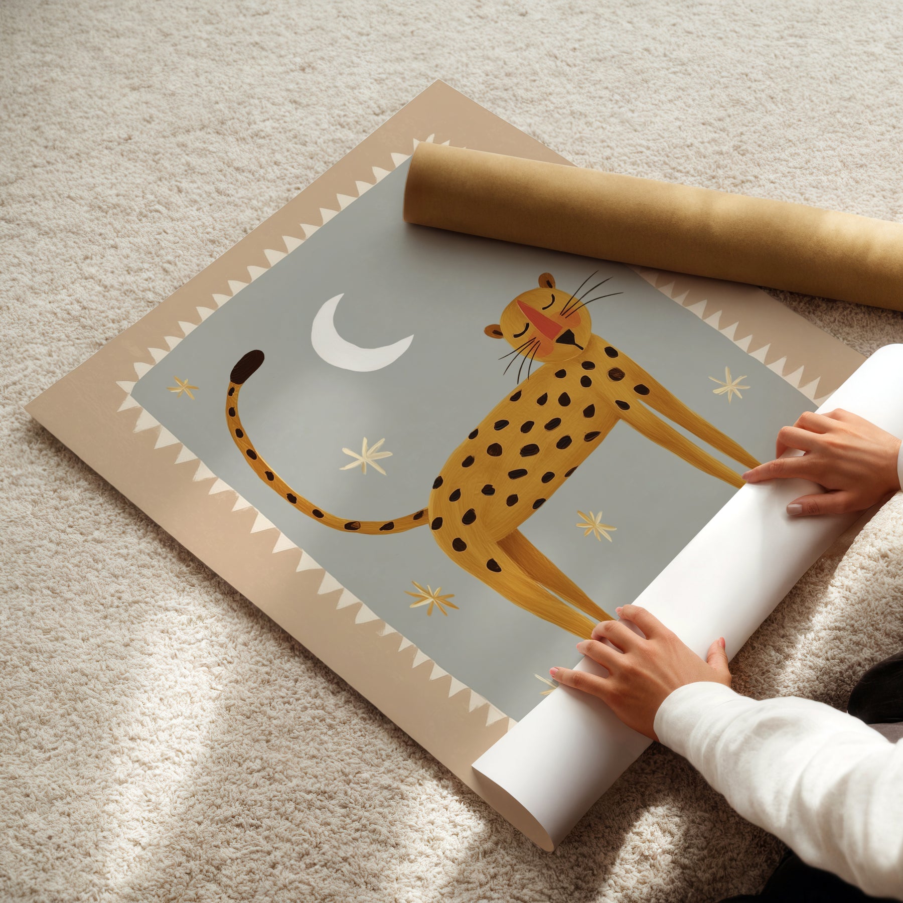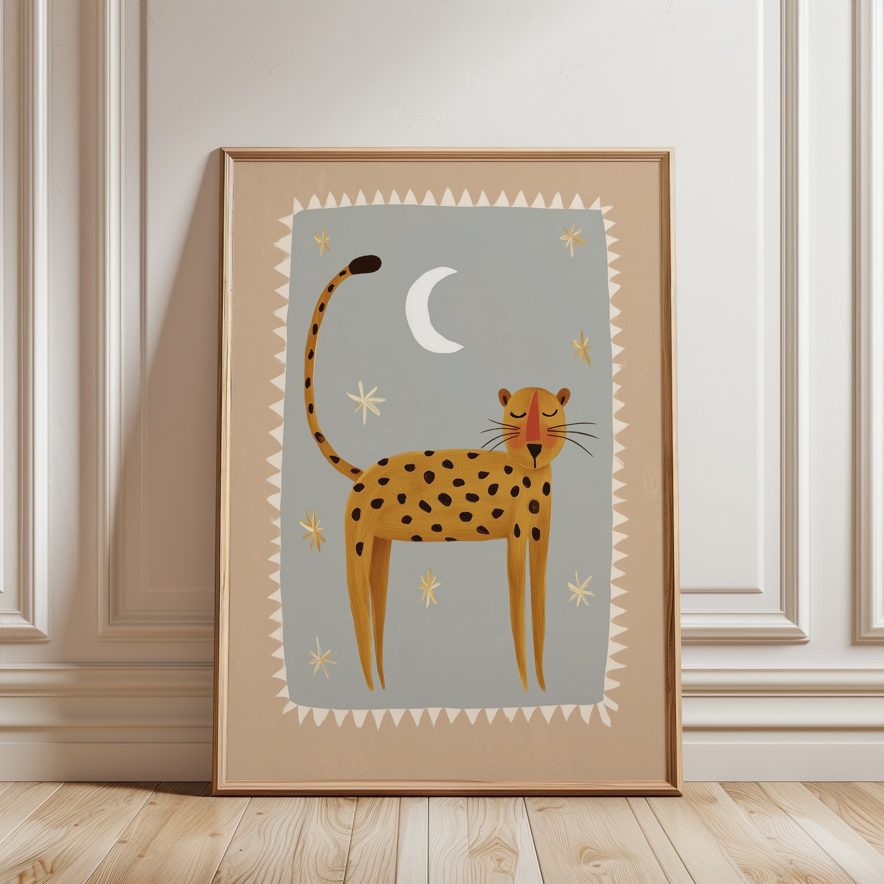 Add peaceful nighttime charm with this beautiful moonlight leopard print — perfect for creating a serene safari nursery atmosphere. This enchanting illustration features happy golden leopard with black spots standing beneath white crescent moon and golden stars on soft sage grey background with cream triangular border, ideal for parents seeking gentle safari nursery decor with folk art elegance and celestial magic. What Makes This Moonlight Leopard Special: • Hand-illustrated with joyful expression and decorative geometric border • Soothing color palette in golden yellow, sage grey, cream, and white perfect for peaceful nurseries • Gender-neutral serene design ideal for safari and celestial-loving kids rooms • Pairs beautifully with wild cats, nighttime, or folk art nursery collections