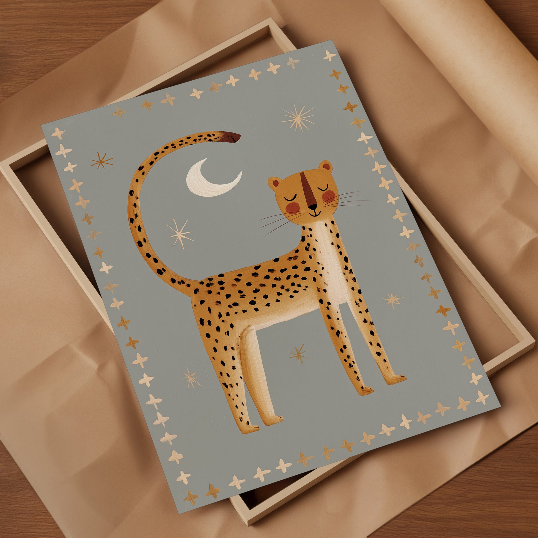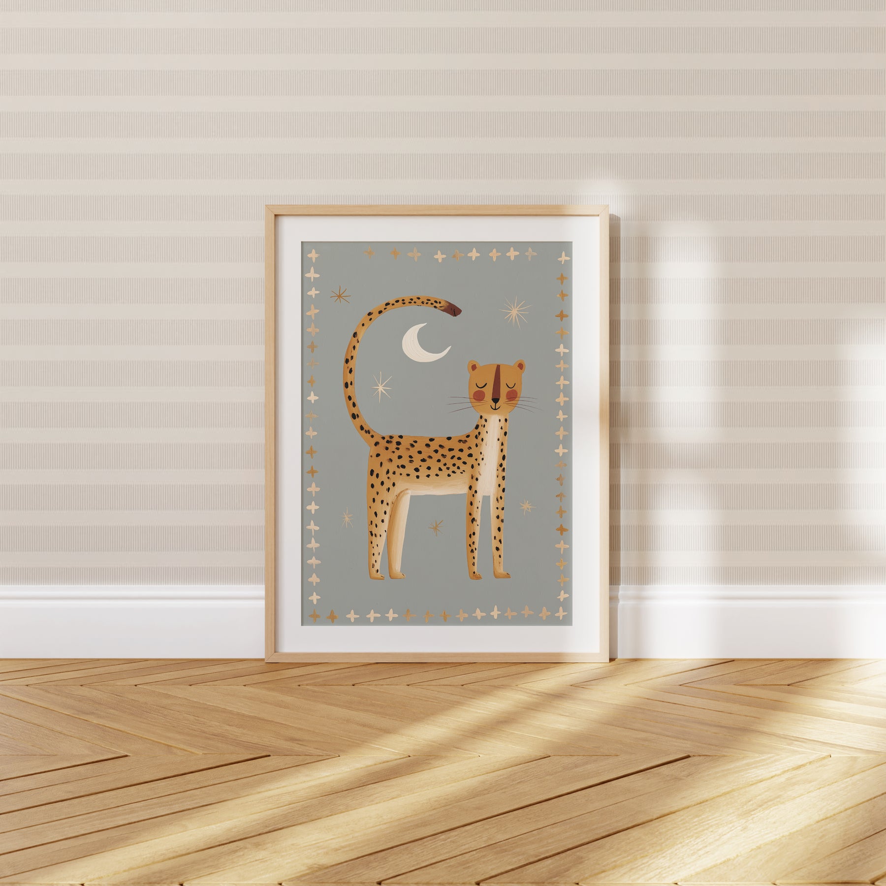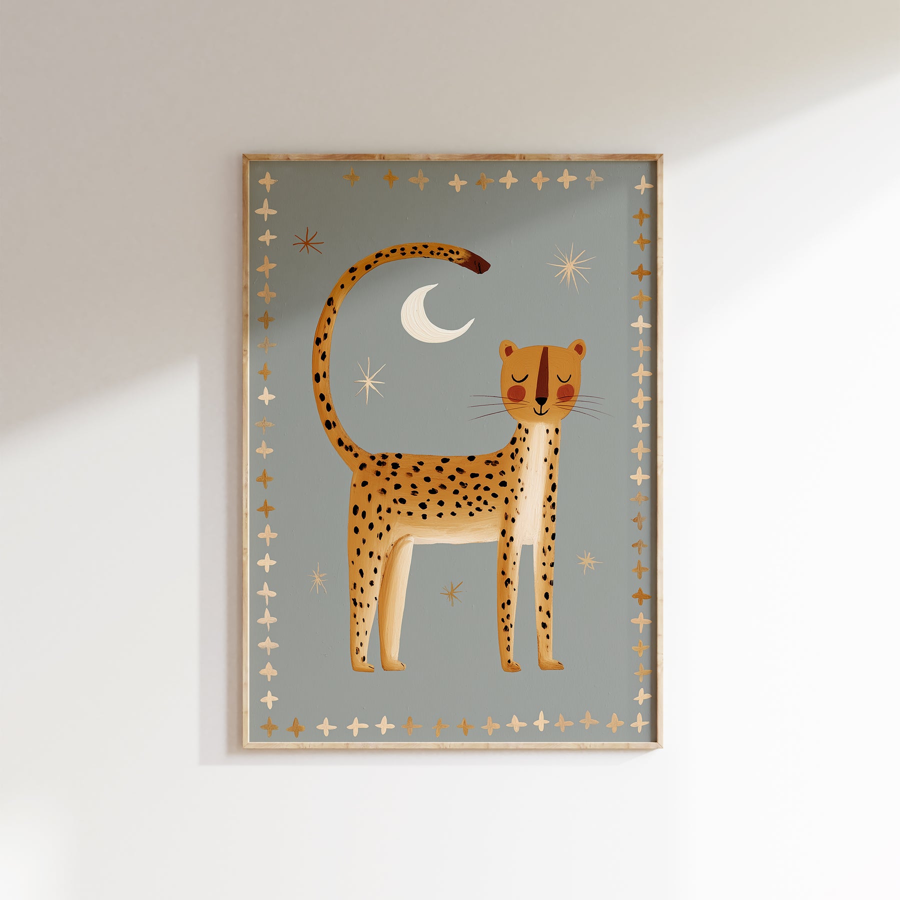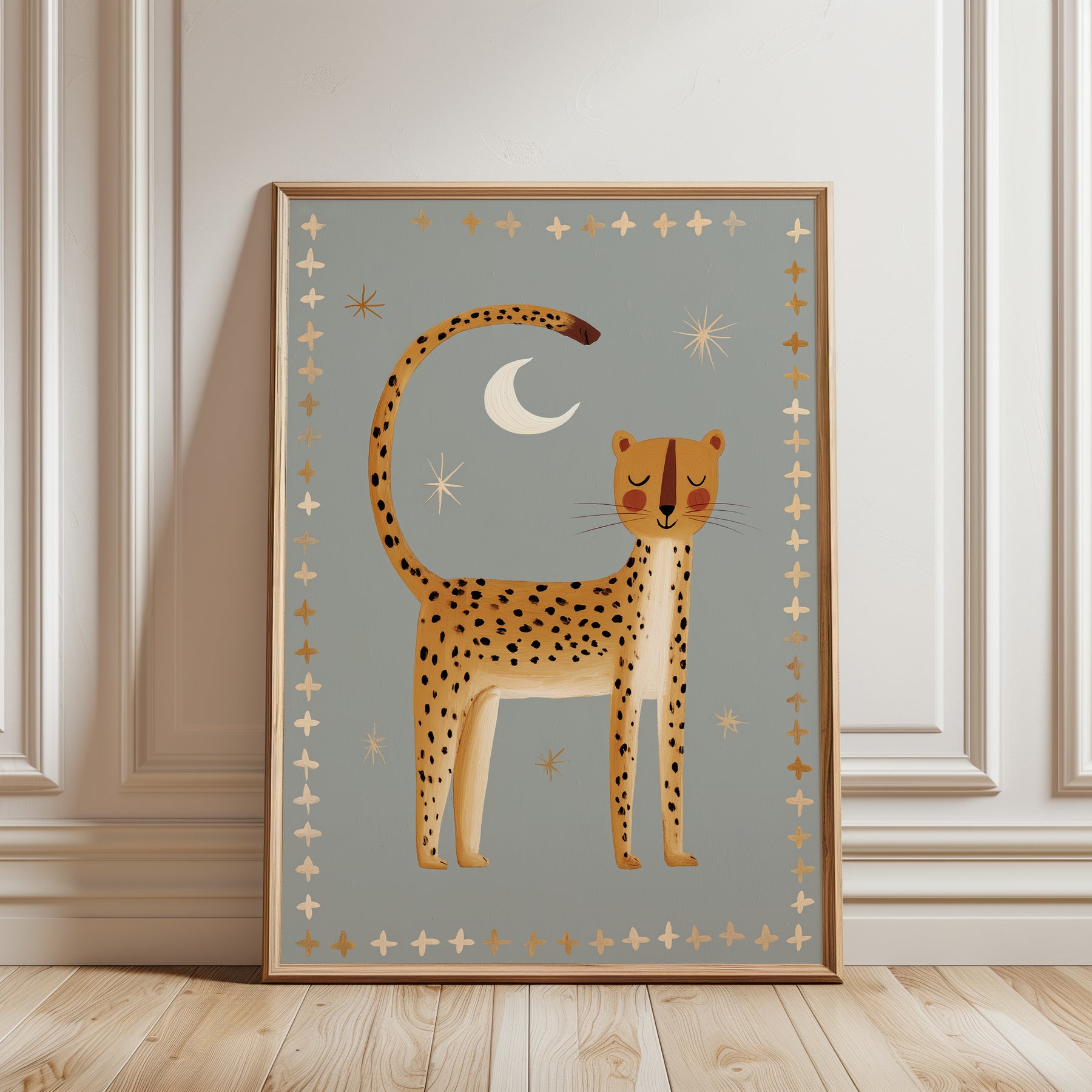 Create serene safari magic with this beautiful nighttime cheetah print — perfect for establishing a peaceful celestial nursery atmosphere. This stunning illustration features golden cheetah with black spots standing beneath white crescent moon and cream stars on soft sage grey background with golden and cream cross border, ideal for parents seeking calm safari nursery decor with folk art elegance and nighttime serenity. What Makes This Nighttime Cheetah Special: • Hand-illustrated with peaceful stance and decorative cross border pattern • Tranquil color palette in golden yellow, sage grey, cream, and white perfect for calming nurseries • Gender-neutral serene design ideal for safari and celestial-themed kids rooms • Pairs beautifully with wild cats, southwestern, or peaceful bedtime nursery collections