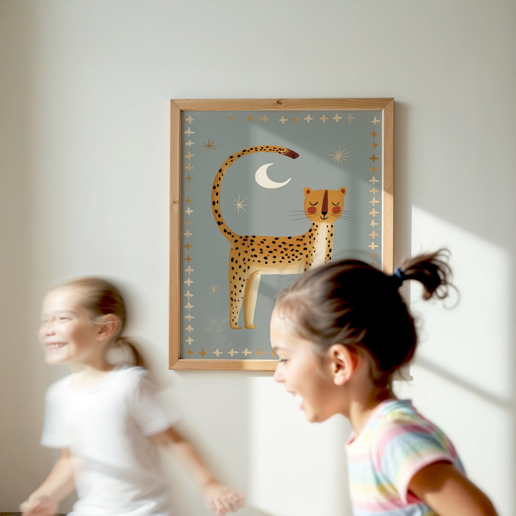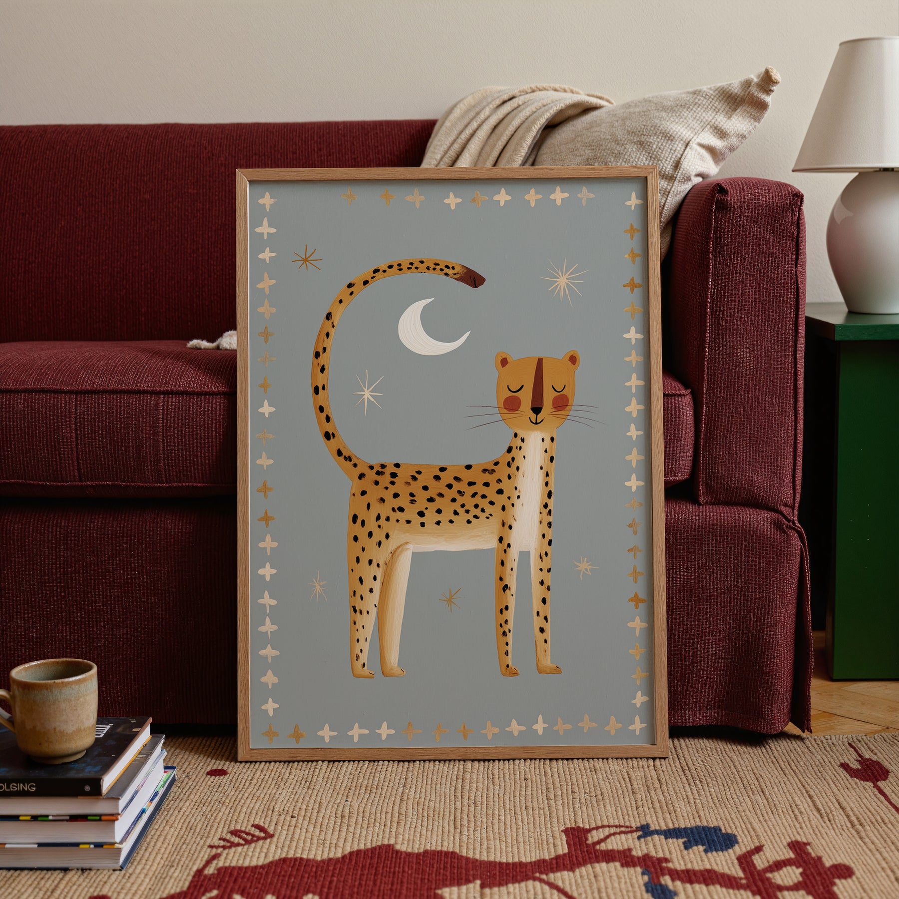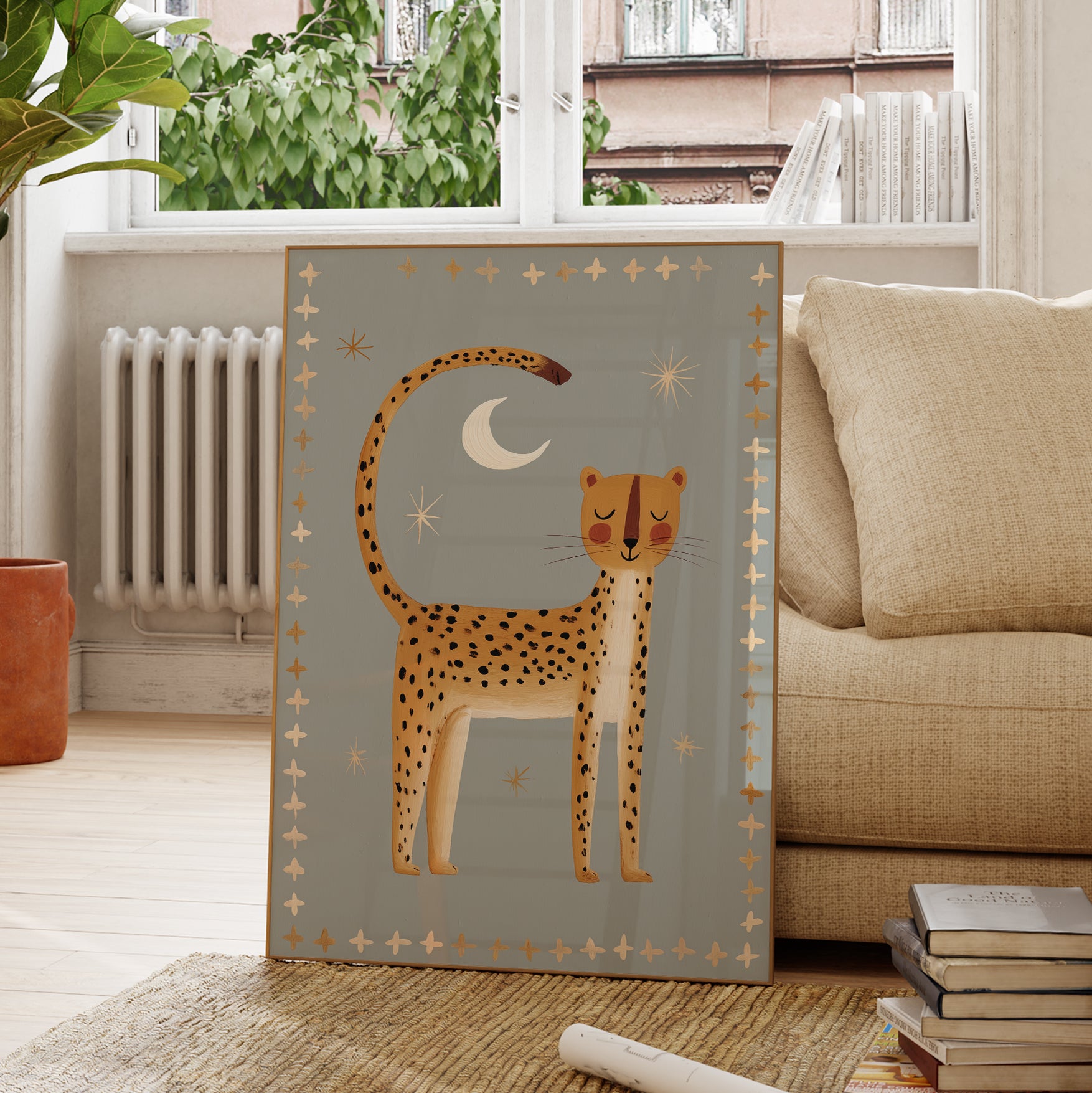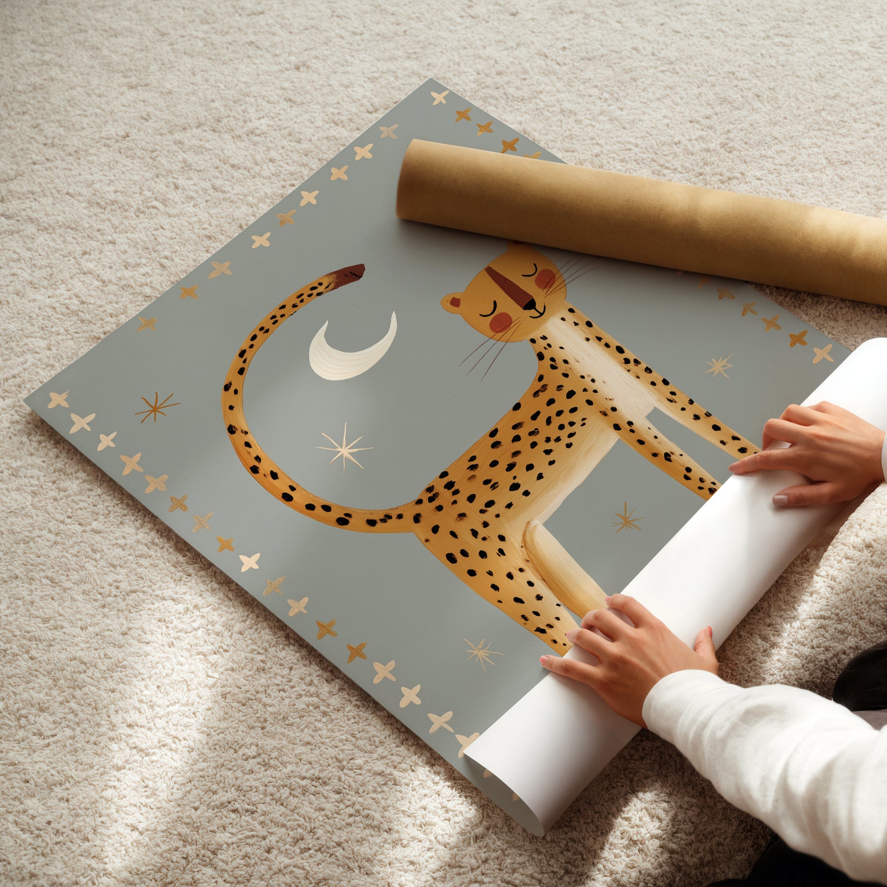 Create serene safari magic with this beautiful nighttime cheetah print — perfect for establishing a peaceful celestial nursery atmosphere. This stunning illustration features golden cheetah with black spots standing beneath white crescent moon and cream stars on soft sage grey background with golden and cream cross border, ideal for parents seeking calm safari nursery decor with folk art elegance and nighttime serenity. What Makes This Nighttime Cheetah Special: • Hand-illustrated with peaceful stance and decorative cross border pattern • Tranquil color palette in golden yellow, sage grey, cream, and white perfect for calming nurseries • Gender-neutral serene design ideal for safari and celestial-themed kids rooms • Pairs beautifully with wild cats, southwestern, or peaceful bedtime nursery collections