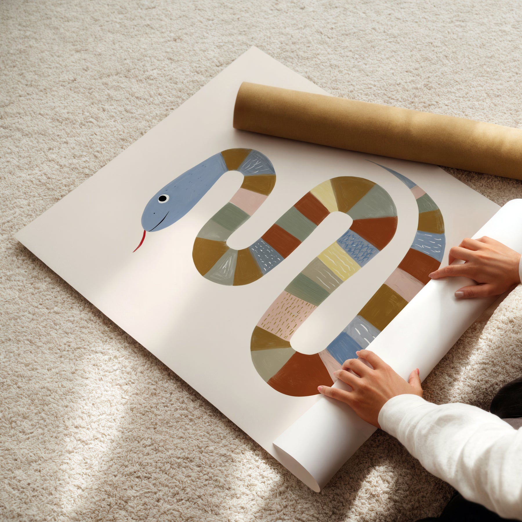 Add unique charm with this beautiful patterned snake print — perfect for creating a distinctive nature-themed nursery atmosphere. This striking illustration features a friendly serpent with colorful striped segments in powder blue, mustard, sage, terracotta, coral, peachy pink, and yellow creating a rainbow pattern, ideal for parents seeking modern reptile nursery decor with contemporary illustrated style and gentle appeal. What Makes This Patterned Snake Special: • Hand-illustrated with diverse textured segments and sweet friendly expression • Colorful palette in blues, mustards, sages, terracottas, and corals perfect for vibrant nurseries • Gender-neutral unique design ideal for nature-loving and pattern-enthusiast kids rooms • Pairs beautifully with reptile, rainbow, or bohemian-inspired nursery collections