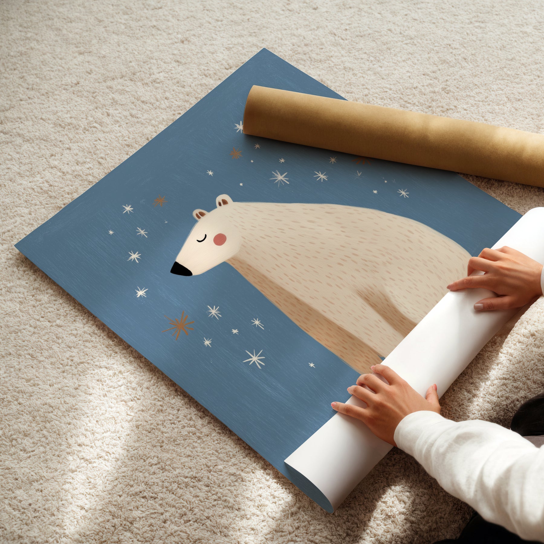 A gentle cream-colored polar bear with sweet rosy cheeks gazes upward at a magnificent starry sky filled with white, golden, and coral stars against a rich slate blue background. The bear's peaceful expression and textured fur create a sense of wonder and tranquility. This serene illustration captures the magic of arctic nights, bringing calm beauty and celestial wonder to any nursery.