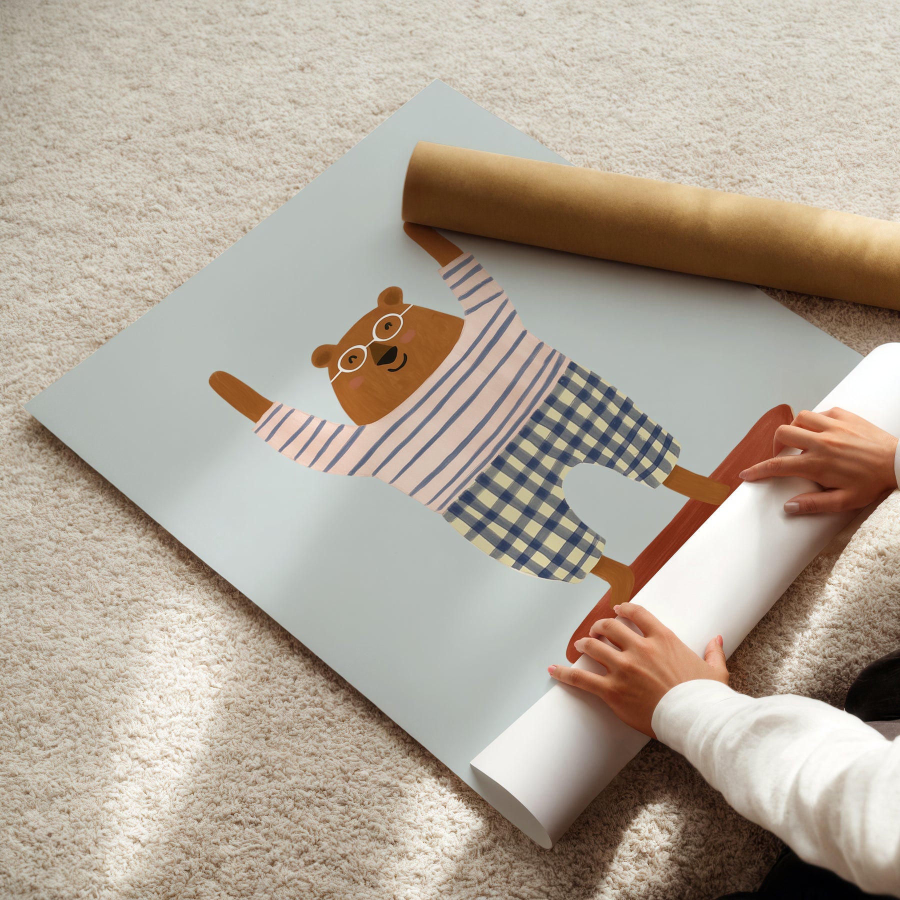 Add charm and personality to your little one's space with this delightful skateboarding bear print — perfect for creating a cheerful, active nursery vibe. This adorable illustration features a friendly brown bear wearing glasses, coral and navy striped shirt, and blue gingham shorts on a coral skateboard, ideal for parents seeking playful animal nursery decor with warmth and character. What Makes This Bear Print Special: • Hand-illustrated with endearing details and mixed pattern textures • Warm color palette in coral, navy, sage blue, and cream perfect for cozy nurseries • Gender-neutral skateboarding theme ideal for active kids room decor • Pairs beautifully with sports, adventure, or animal-themed nursery collections