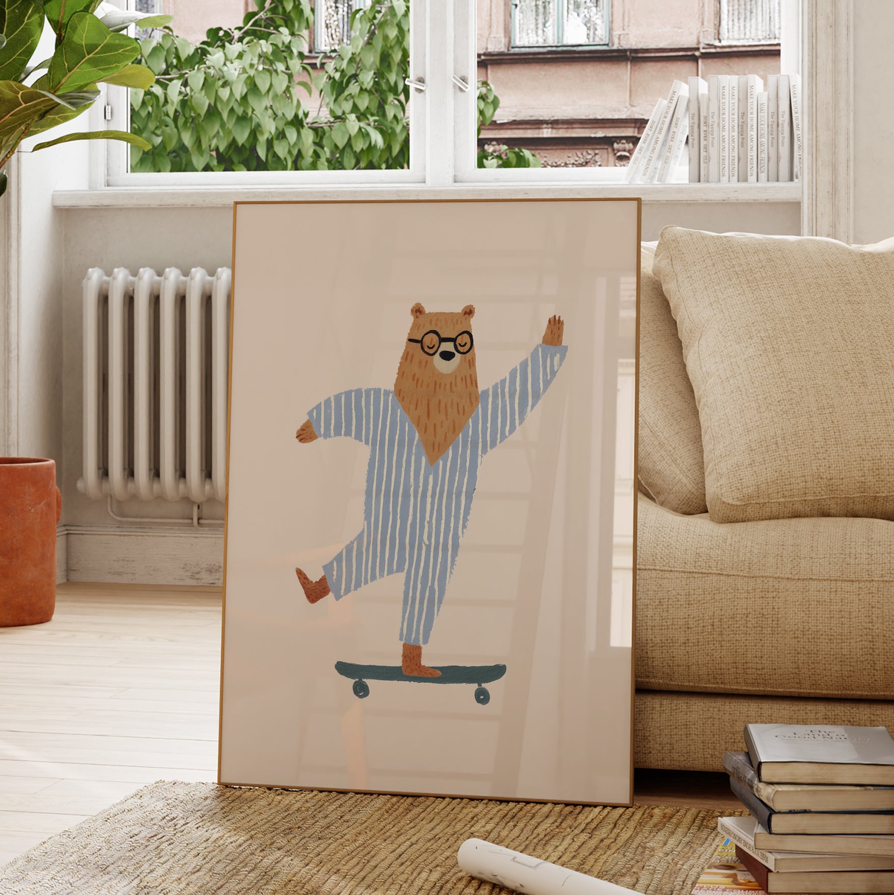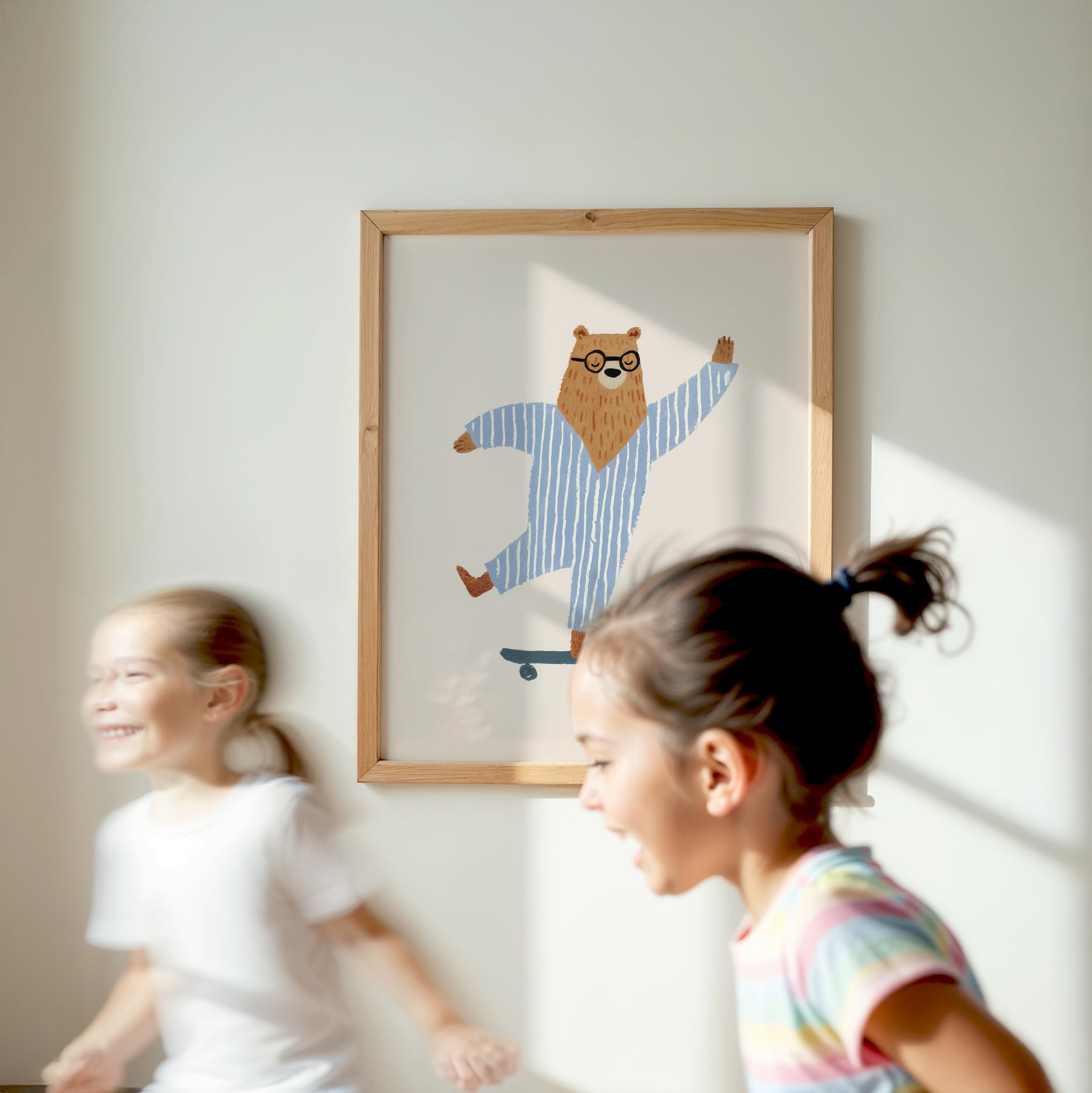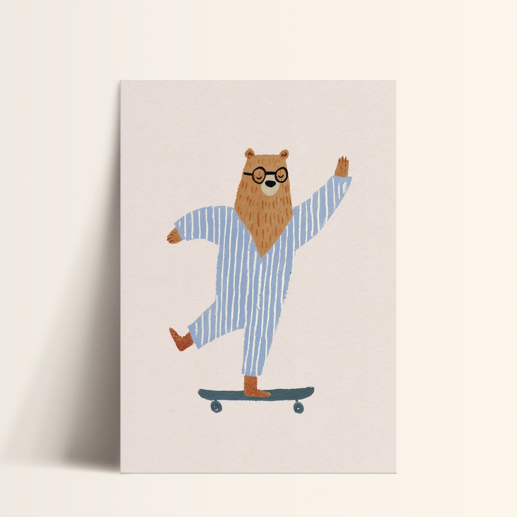 A cheerful brown bear wearing round glasses and cozy blue and white striped pajamas rides a teal skateboard with confident joy against a clean cream background. The bear's adorable outfit and playful pose create an endearing bedtime-meets-adventure character. This fun illustration brings personality, humor, and contemporary cool to nurseries with its unique combination of sleepwear and skateboarding.