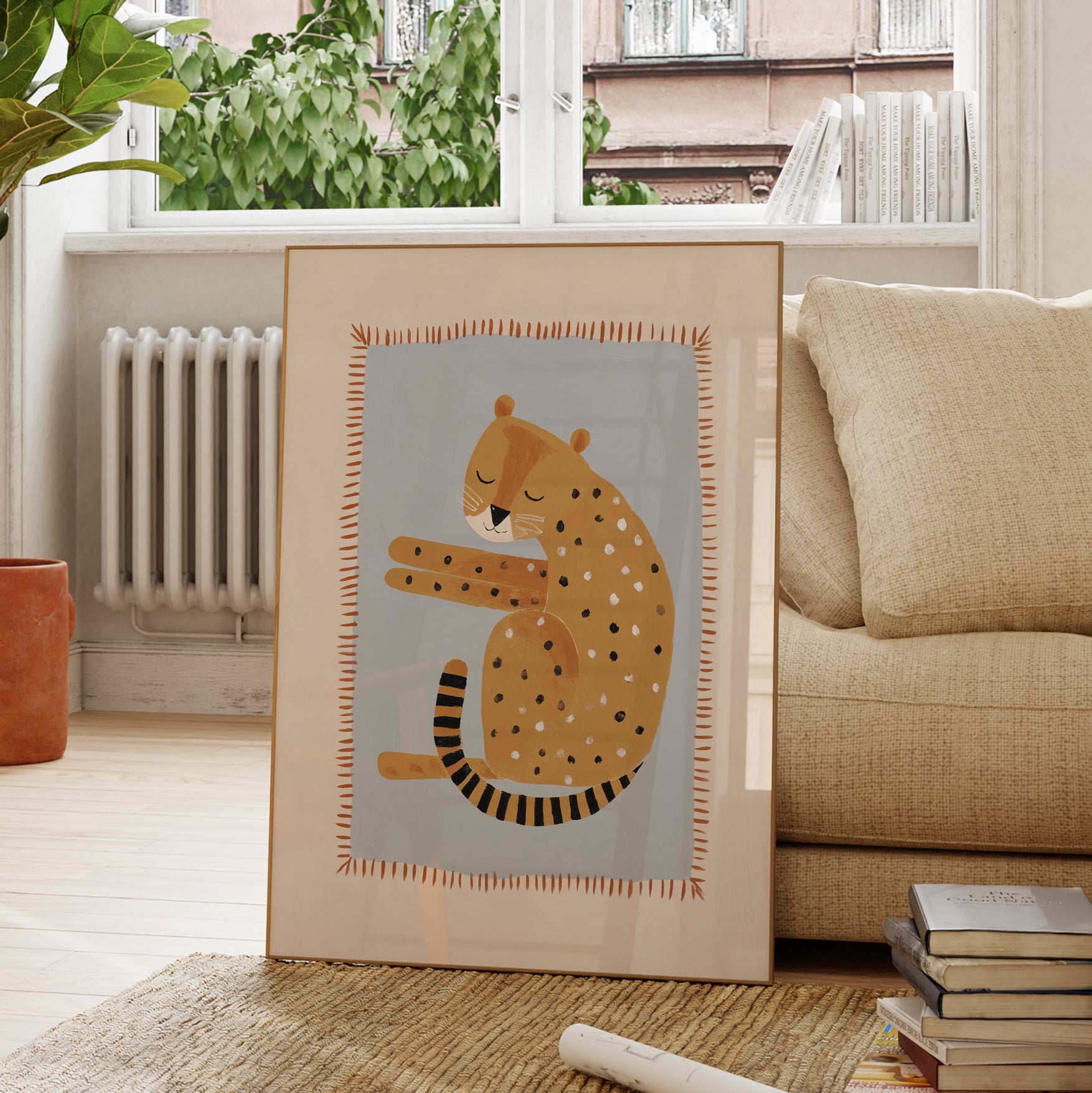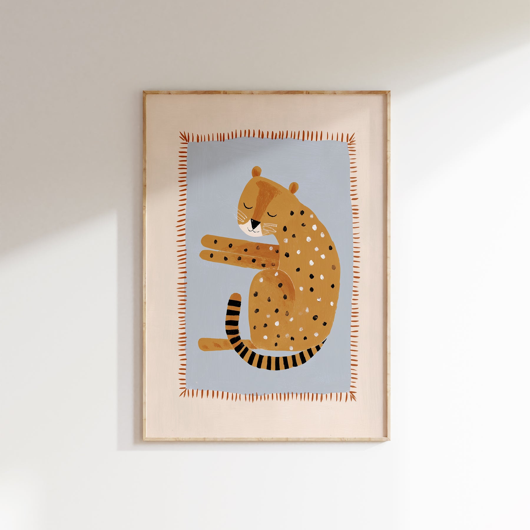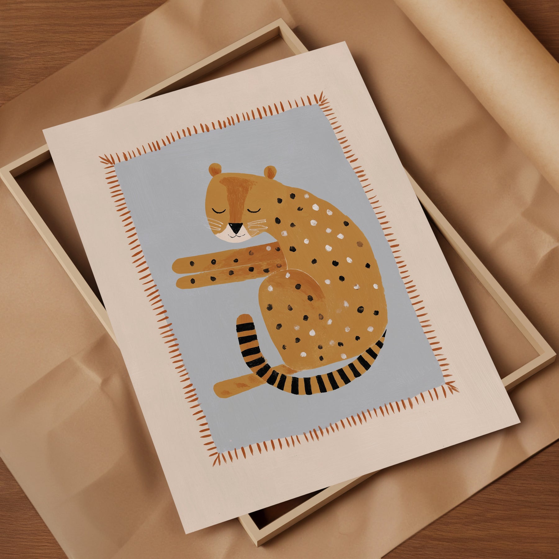 Add gentle safari charm with this adorable sleepy cheetah print — perfect for creating a peaceful wild cat nursery atmosphere. This sweet illustration features resting golden cheetah with spots and striped tail on soft blue-grey background surrounded by terracotta decorative border, ideal for parents seeking calm safari nursery decor with folk art warmth and restful energy. What Makes This Sleepy Cheetah Special: • Hand-illustrated with peaceful sleeping pose and detailed spot patterns • Soft color palette in golden yellow, terracotta, blue-grey, and cream perfect for calm nurseries • Gender-neutral serene design ideal for bedtime and safari-loving kids rooms • Pairs beautifully with wild cats, southwestern, or peaceful animal nursery collections
