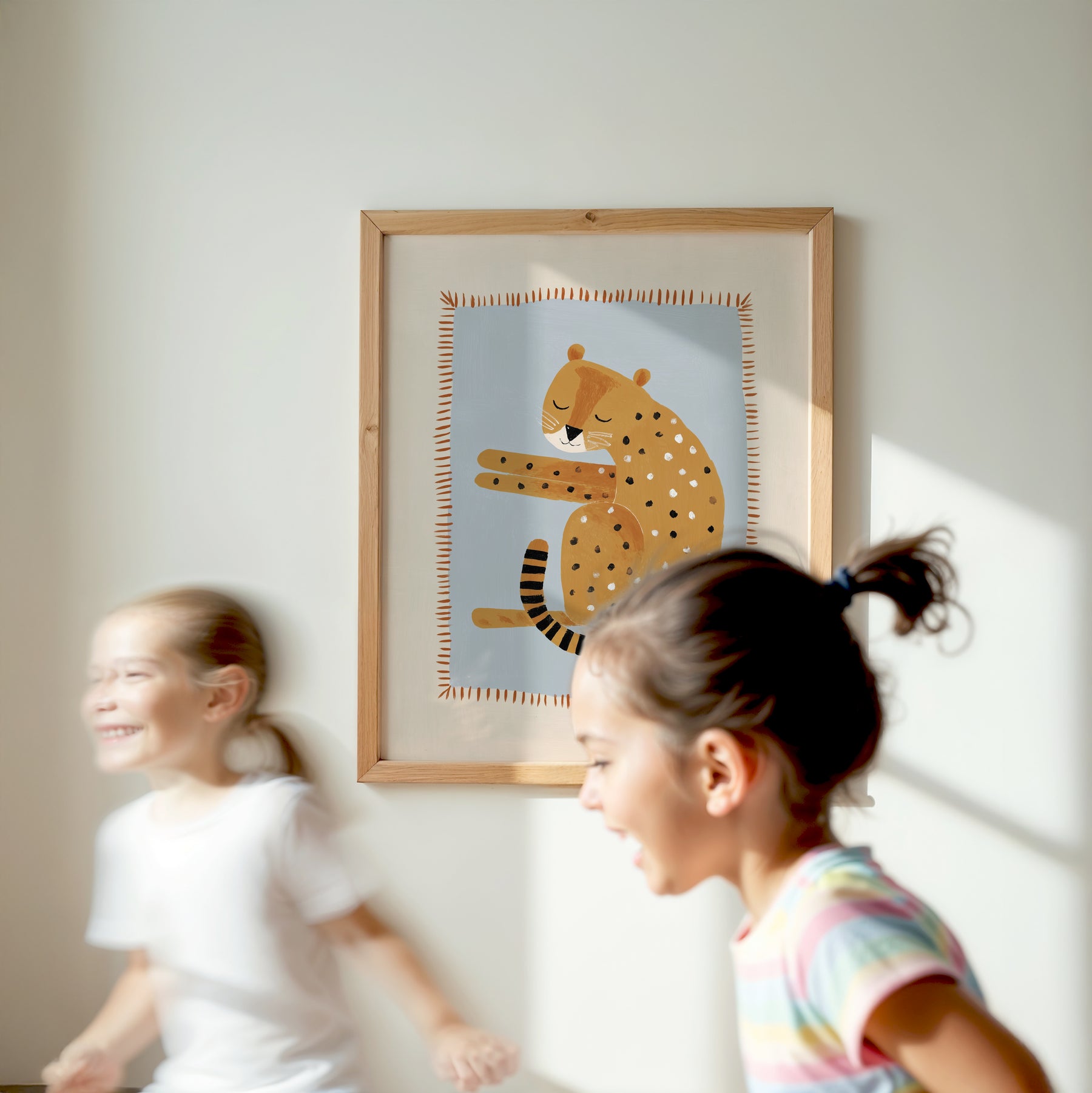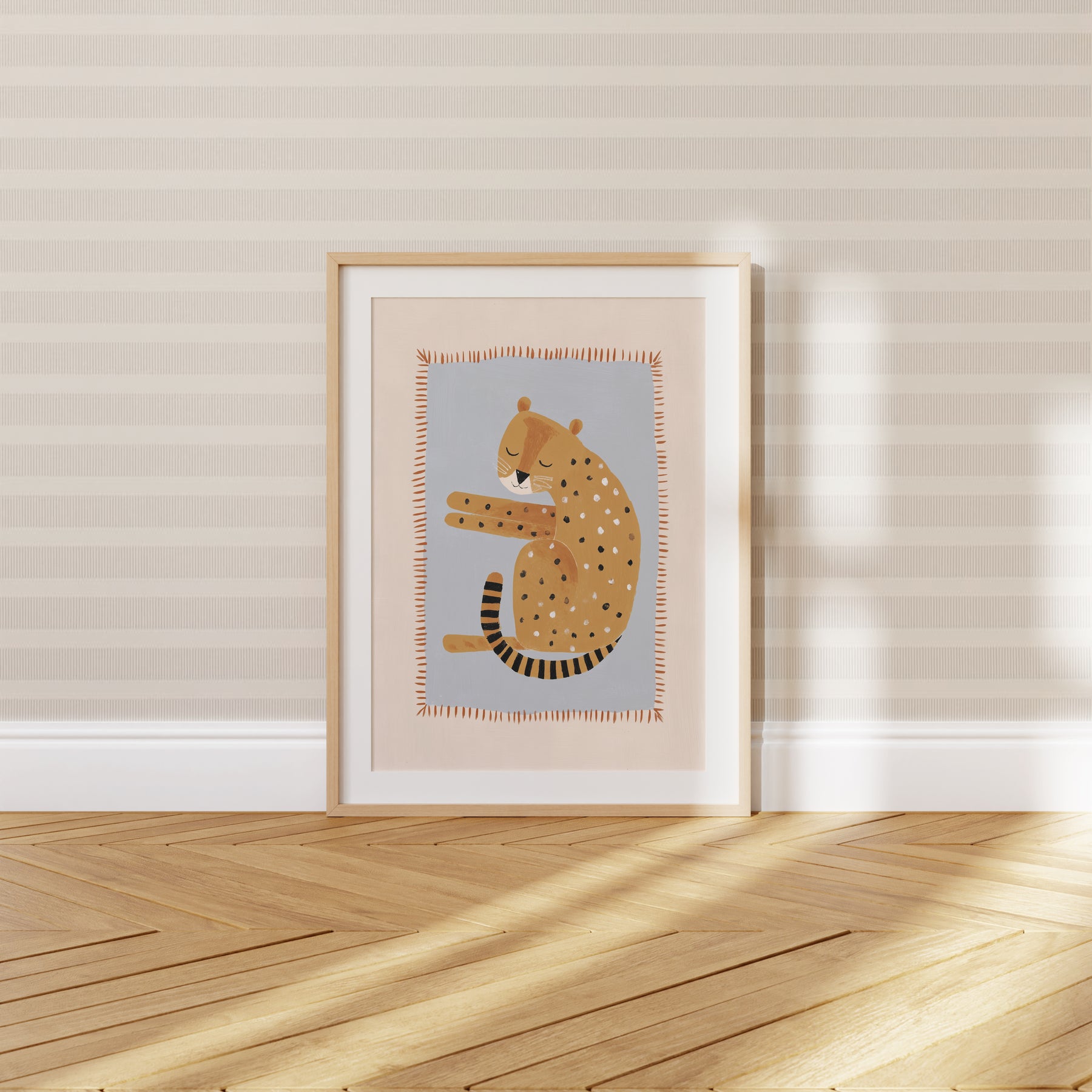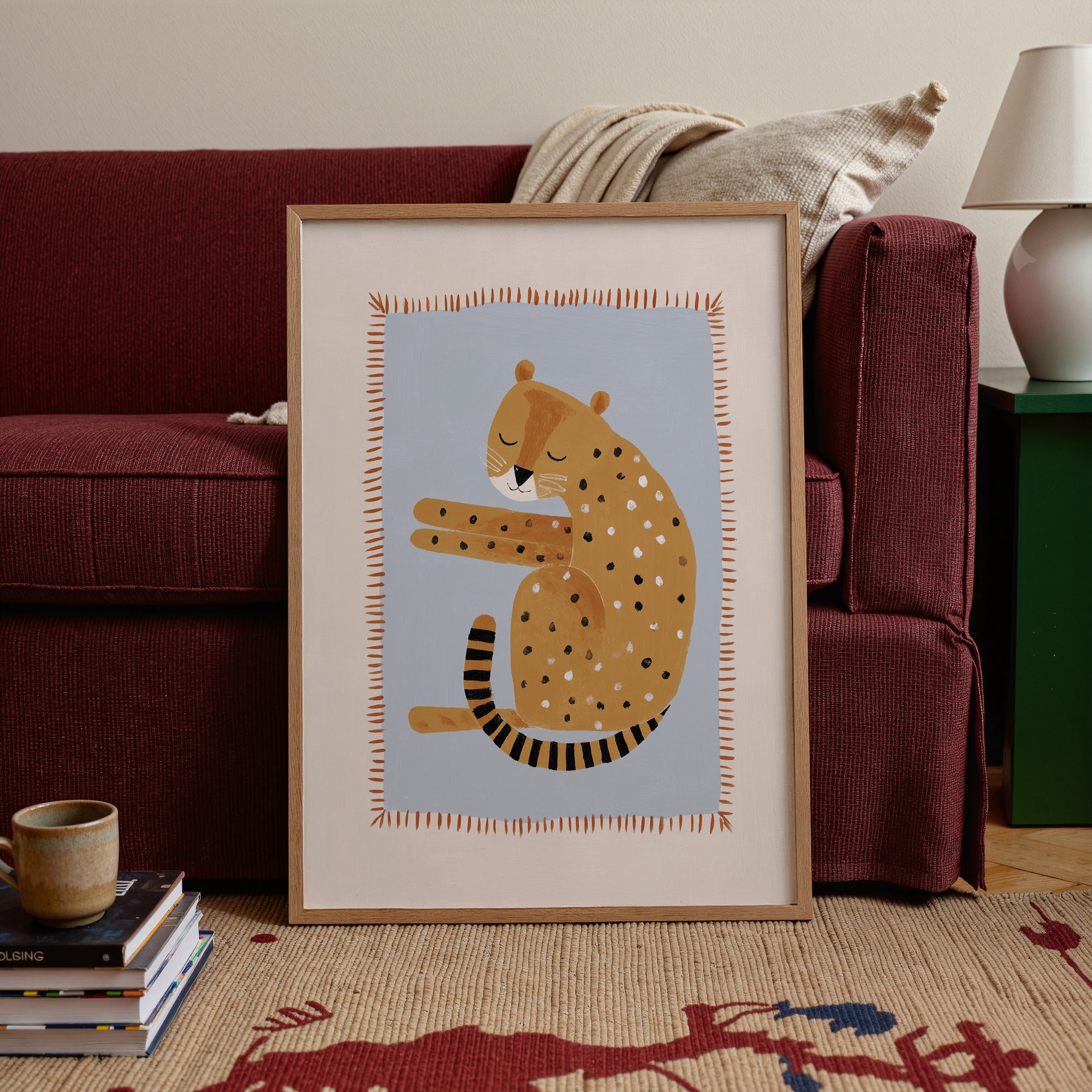 Add gentle safari charm with this adorable sleepy cheetah print — perfect for creating a peaceful wild cat nursery atmosphere. This sweet illustration features resting golden cheetah with spots and striped tail on soft blue-grey background surrounded by terracotta decorative border, ideal for parents seeking calm safari nursery decor with folk art warmth and restful energy. What Makes This Sleepy Cheetah Special: • Hand-illustrated with peaceful sleeping pose and detailed spot patterns • Soft color palette in golden yellow, terracotta, blue-grey, and cream perfect for calm nurseries • Gender-neutral serene design ideal for bedtime and safari-loving kids rooms • Pairs beautifully with wild cats, southwestern, or peaceful animal nursery collections