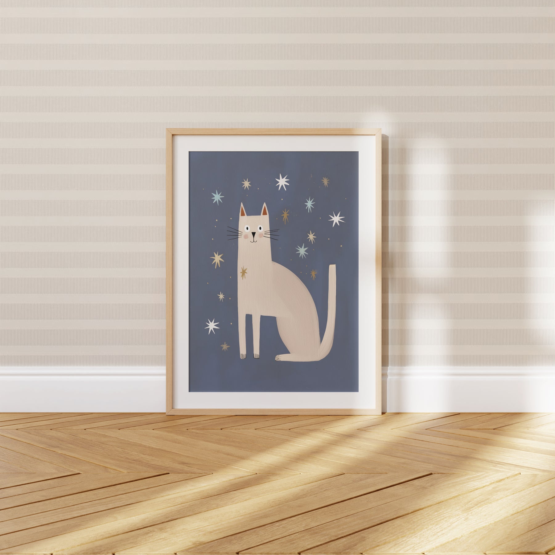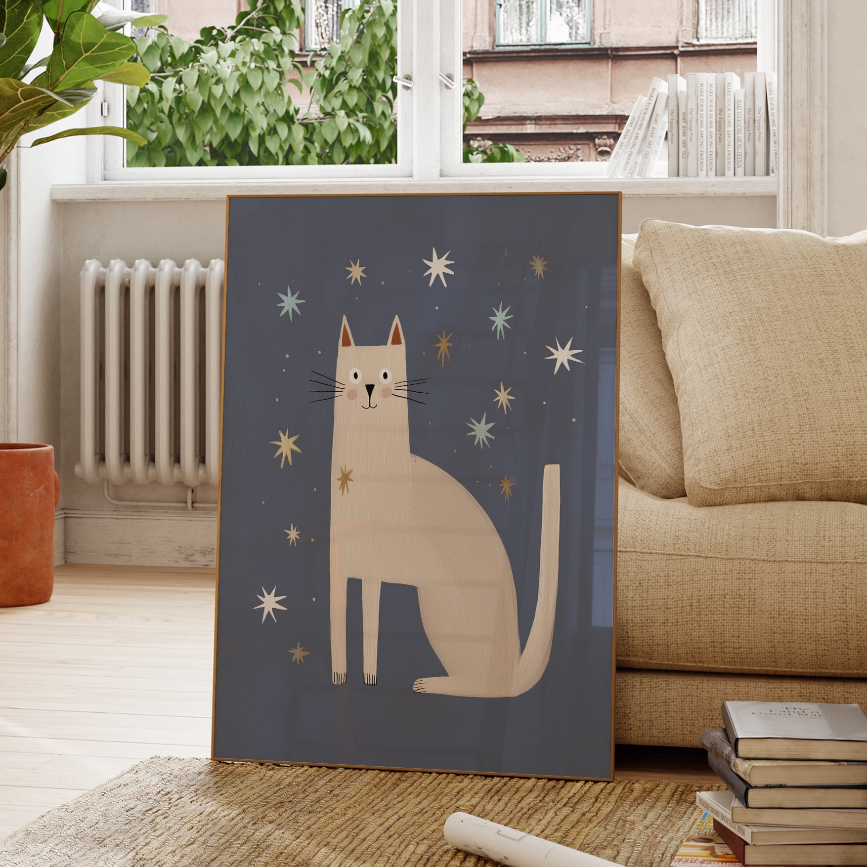 Create peaceful nighttime magic with this beautiful starry night cat print — perfect for establishing a serene celestial nursery atmosphere. This elegant illustration features graceful cream cat with terracotta ears sitting tall beneath cream, powder blue, and golden stars on deep navy background, ideal for parents seeking sophisticated cat nursery decor with modern celestial charm and bedtime tranquility. What Makes This Starry Night Cat Special: • Hand-illustrated with elegant cat proportions and decorative star patterns • Celestial color palette in cream, terracotta, powder blue, golden yellow, and navy perfect for calming nurseries • Gender-neutral serene design ideal for cat-loving and celestial-themed kids rooms • Pairs beautifully with nighttime, stars, or elegant pet nursery collections