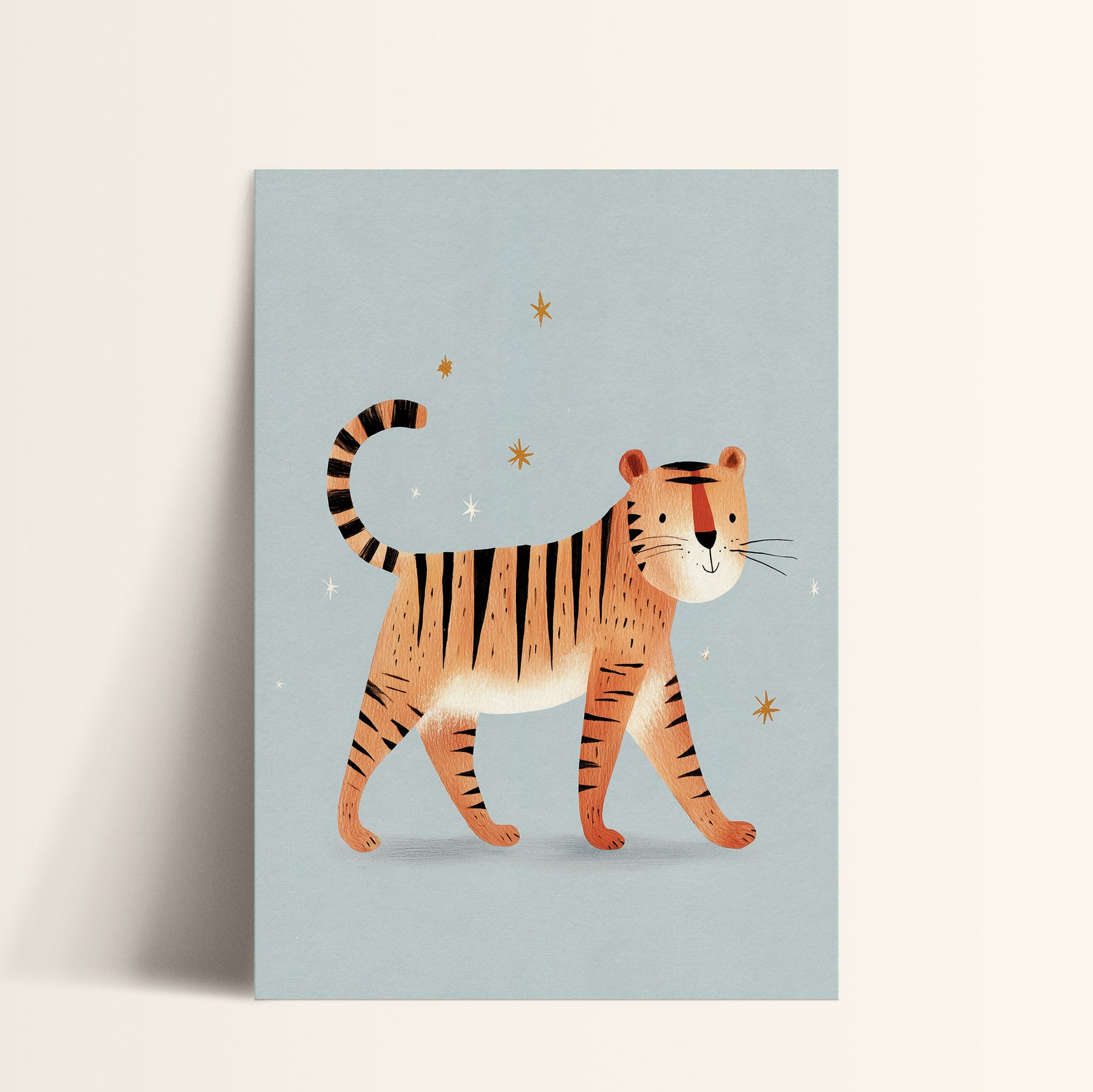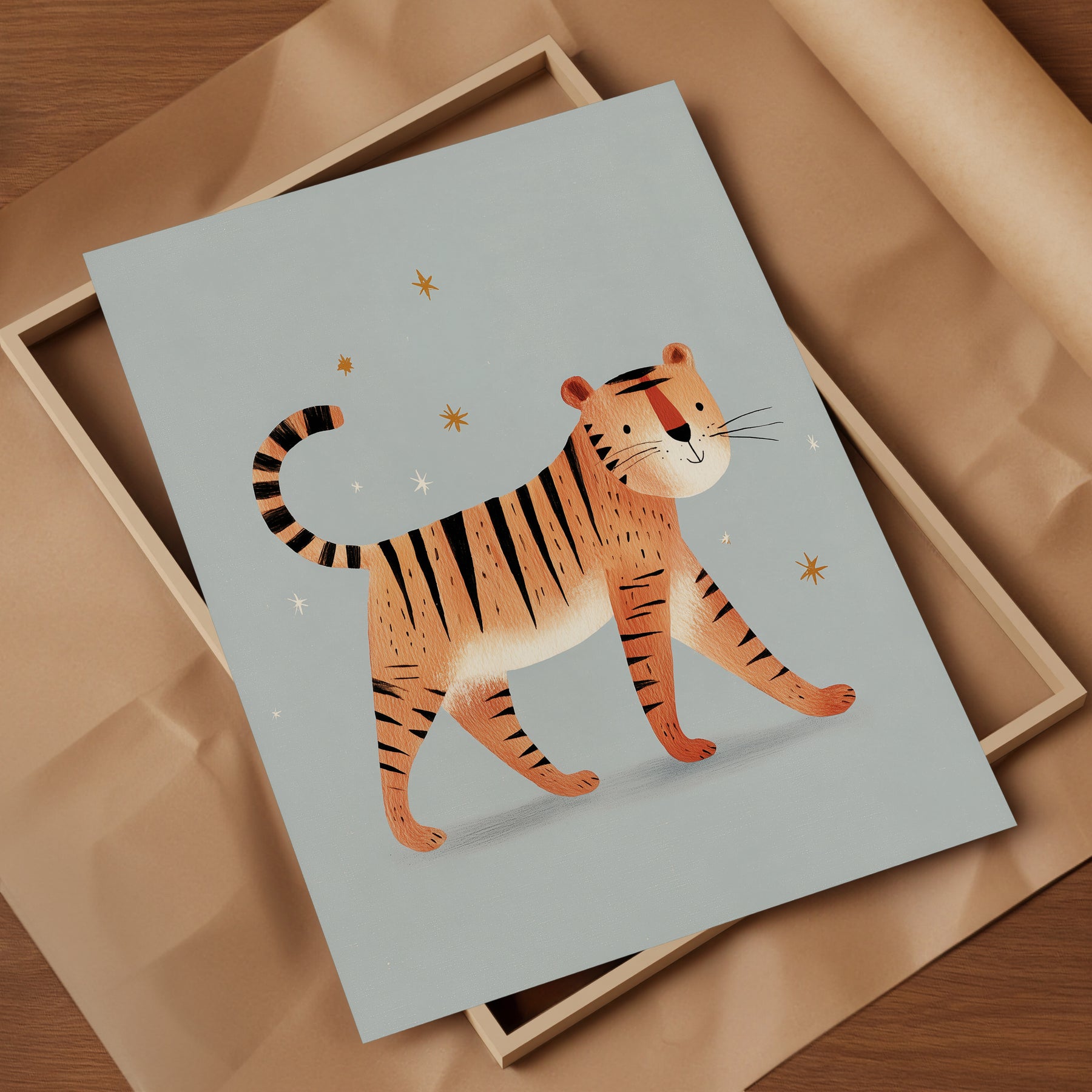 A magnificent orange tiger with bold black stripes and expressive whiskers stands proudly against a soft sage blue background dotted with delicate golden and white stars. The textured brushstroke details and confident pose create a regal yet friendly presence. This beautiful portrait brings safari elegance and celestial charm to nurseries with its sophisticated color combination and gentle starry atmosphere.