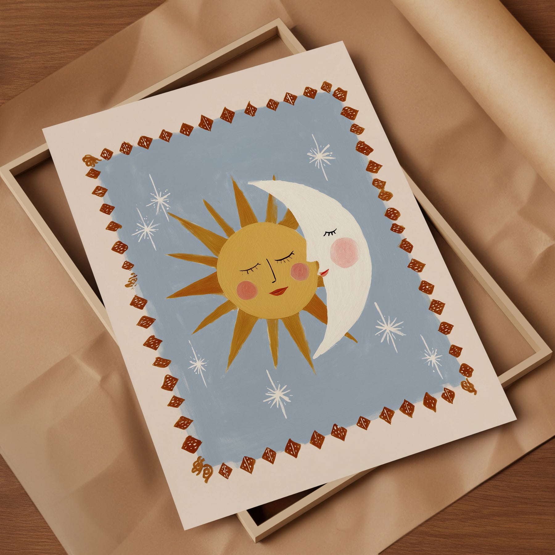 Celebrate celestial harmony with this tender sun hugging moon print — perfect for creating a loving bedtime nursery atmosphere. This heartwarming illustration features golden sun with rosy cheeks embracing cream crescent moon surrounded by white stars on soft powder blue sky with terracotta diamond border, ideal for parents seeking sweet celestial nursery decor with modern folk art warmth and togetherness. What Makes This Sun Hugging Moon Special: • Hand-illustrated with loving embrace and endearing facial expressions • Gentle color palette in golden yellow, cream, powder blue, coral, and terracotta perfect for peaceful nurseries • Gender-neutral affectionate design ideal for love-filled and celestial-themed kids rooms • Pairs beautifully with day and night, love, or southwestern nursery collections