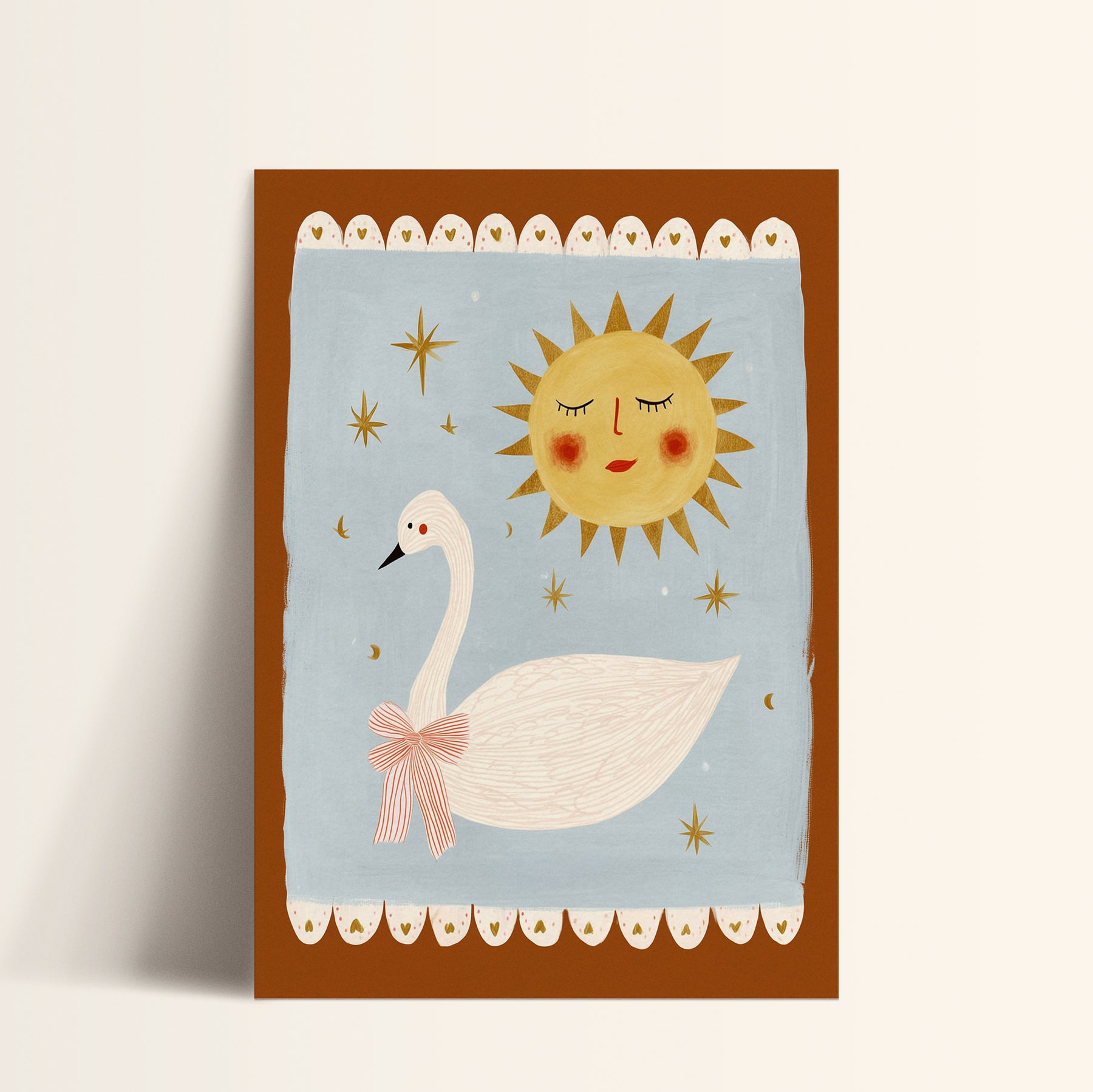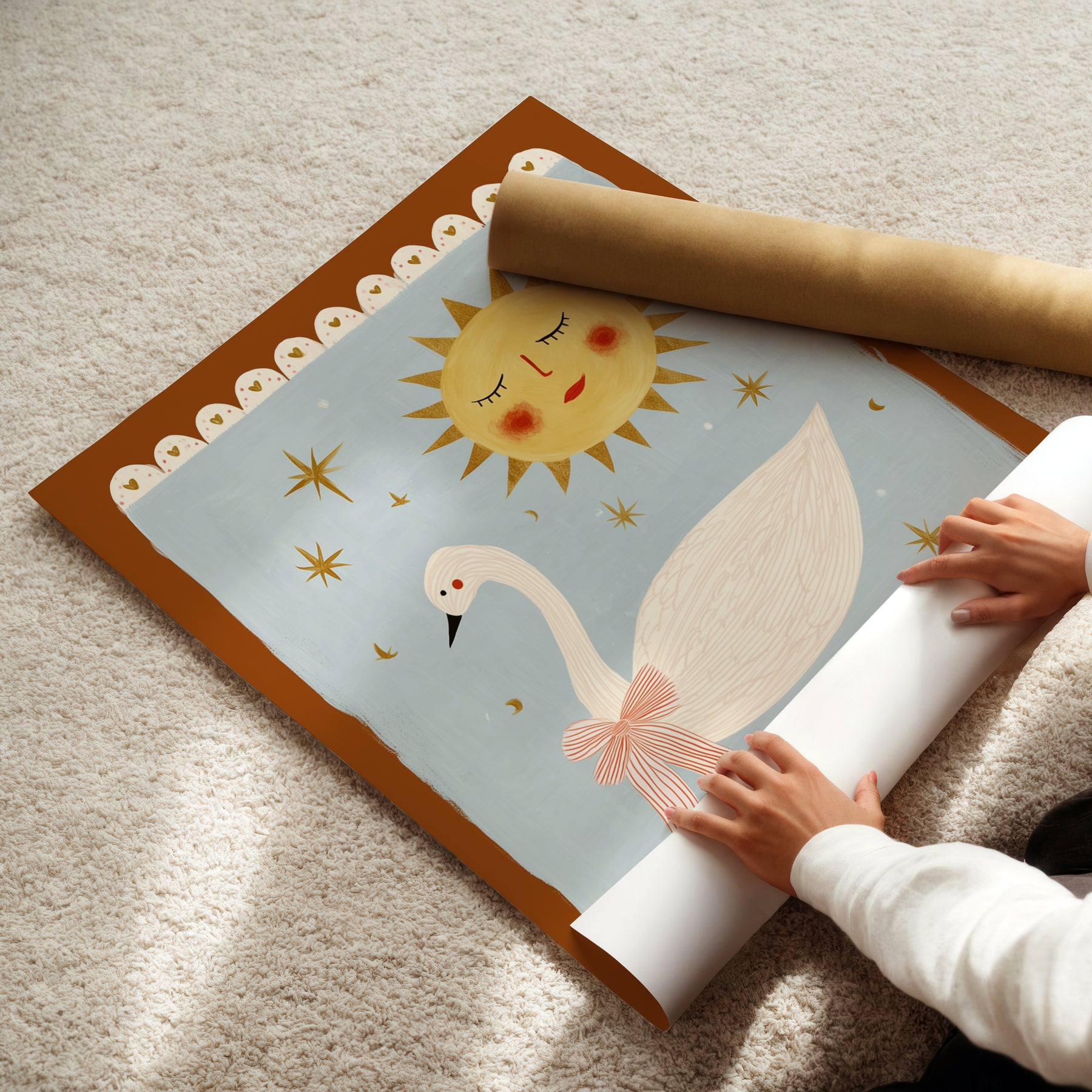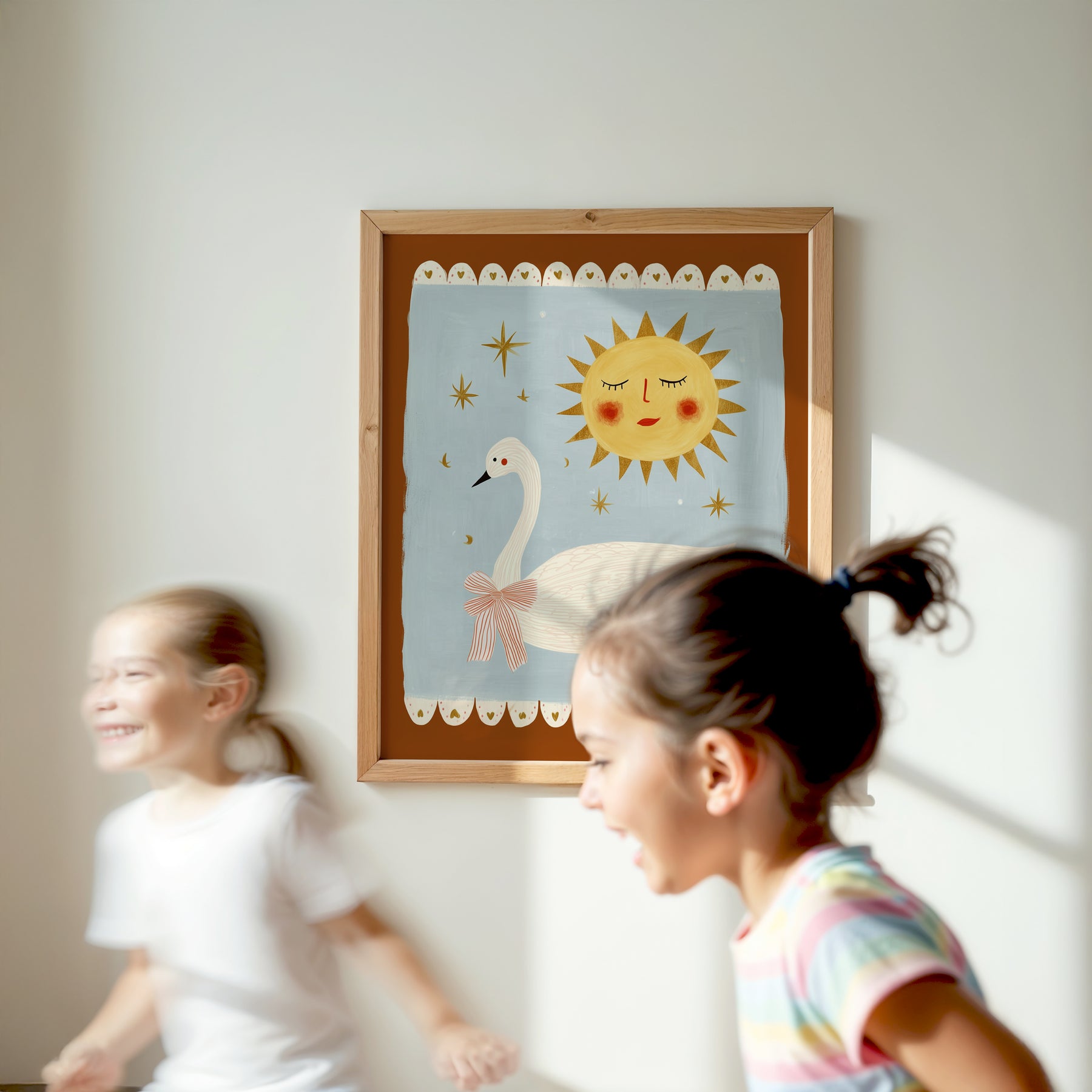 A graceful white swan wearing a charming striped bow floats beneath a golden sun with closed eyes and rosy cheeks, all framed by a whimsical scalloped border in warm caramel tones. This enchanting folk art piece features a serene powder blue sky dotted with golden stars and tiny crescents, creating a magical celestial atmosphere. The vintage-inspired design brings a sweet, timeless charm to any nursery or children's space. What Makes This Swan and Sun Print Special: • Hand-illustrated with whimsical folk art details and decorative border • Soft blue sky with golden celestial accents perfect for dreamy nurseries • Gender-neutral vintage-inspired design ideal for traditional or bohemian spaces • Pairs beautifully with other folk art animals and celestial themes