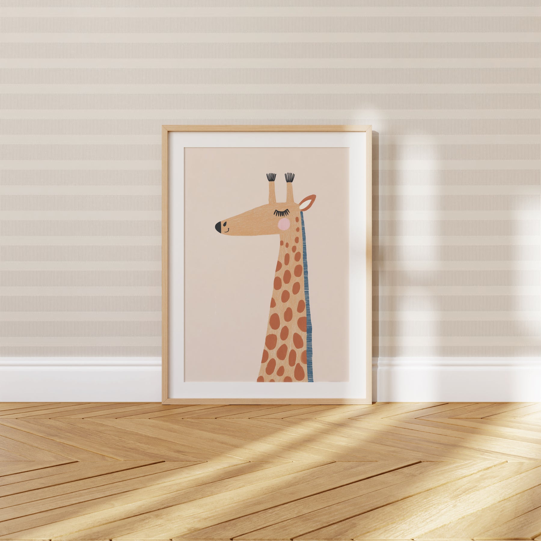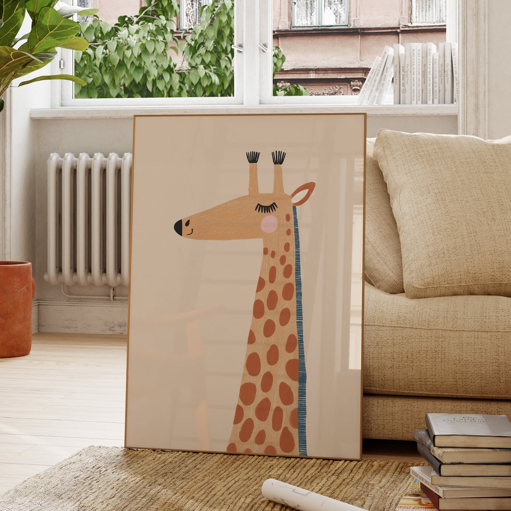 Bring gentle safari charm to your child's space with this sweet giraffe portrait print — perfect for creating a calm animal-themed nursery atmosphere. This tender illustration features an adorable giraffe with closed eyes, pink blush cheeks, and textured spots in warm golden and terracotta tones, ideal for parents seeking gentle giraffe nursery decor with modern minimalist style and soothing presence. What Makes This Giraffe Print Special: • Hand-illustrated with soft expression and natural textured details • Warm color palette in golden tan, terracotta, slate blue, pink, and cream perfect for peaceful nurseries • Gender-neutral gentle design ideal for safari and animal-loving kids rooms • Pairs beautifully with African safari, woodland, or calm animal nursery collections