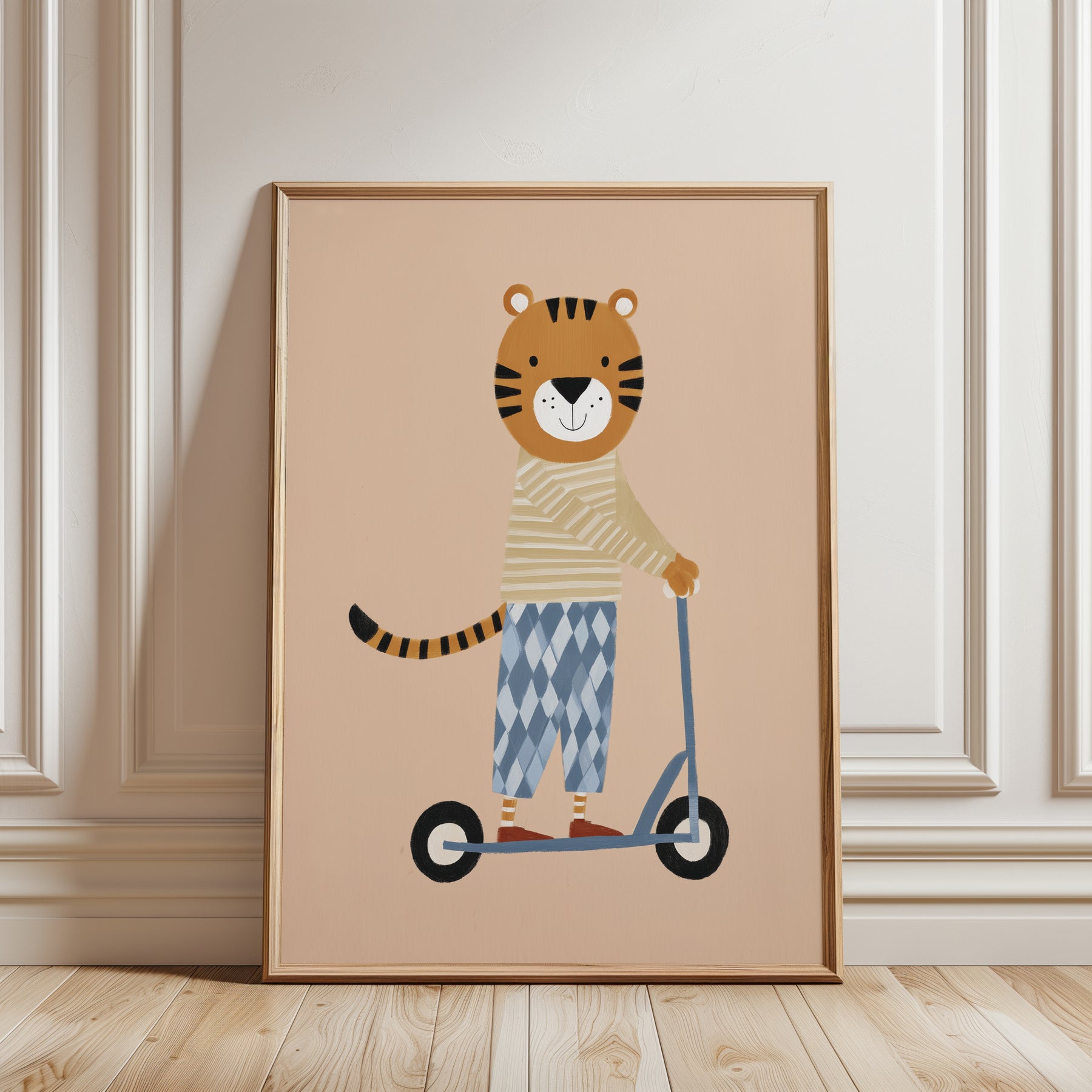 Add cheerful movement to your child's space with this adorable tiger on scooter print — perfect for creating a lively safari-themed nursery atmosphere. This delightful illustration features a friendly tiger wearing cream striped shirt and blue diamond-patterned pants riding a scooter on a warm peach background, ideal for parents seeking playful safari nursery decor with a modern illustrated style. What Makes This Tiger Scooter Print Special: • Hand-illustrated with charming details and geometric pattern clothing • Warm color palette in orange, cream, navy, slate blue, and peach perfect for inviting nurseries • Gender-neutral active design ideal for adventure-loving kids rooms • Pairs beautifully with scooter, safari, or transportation-themed nursery collections