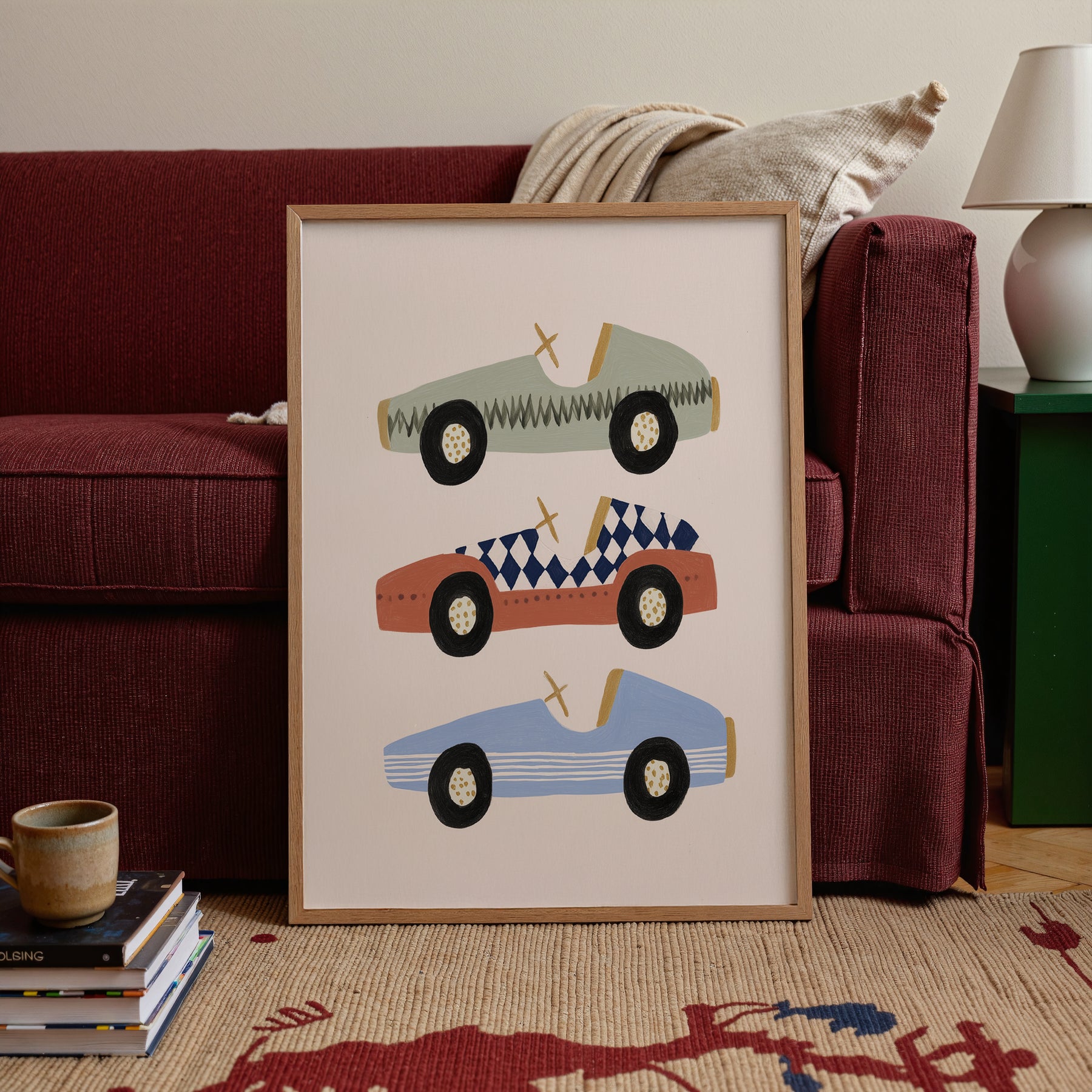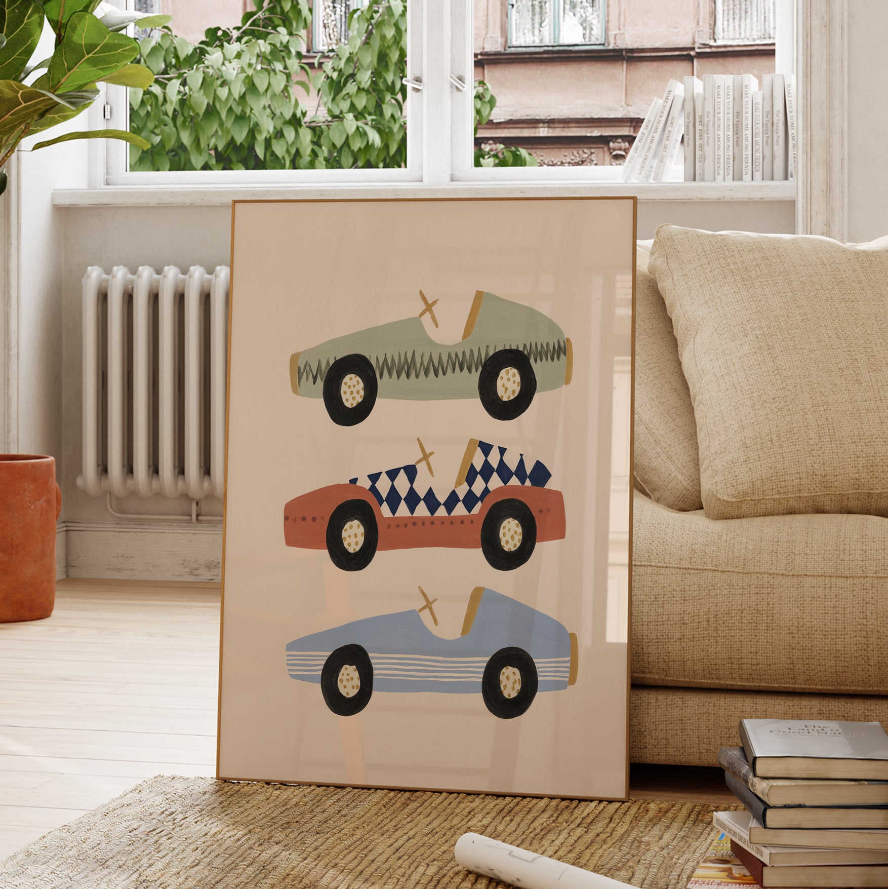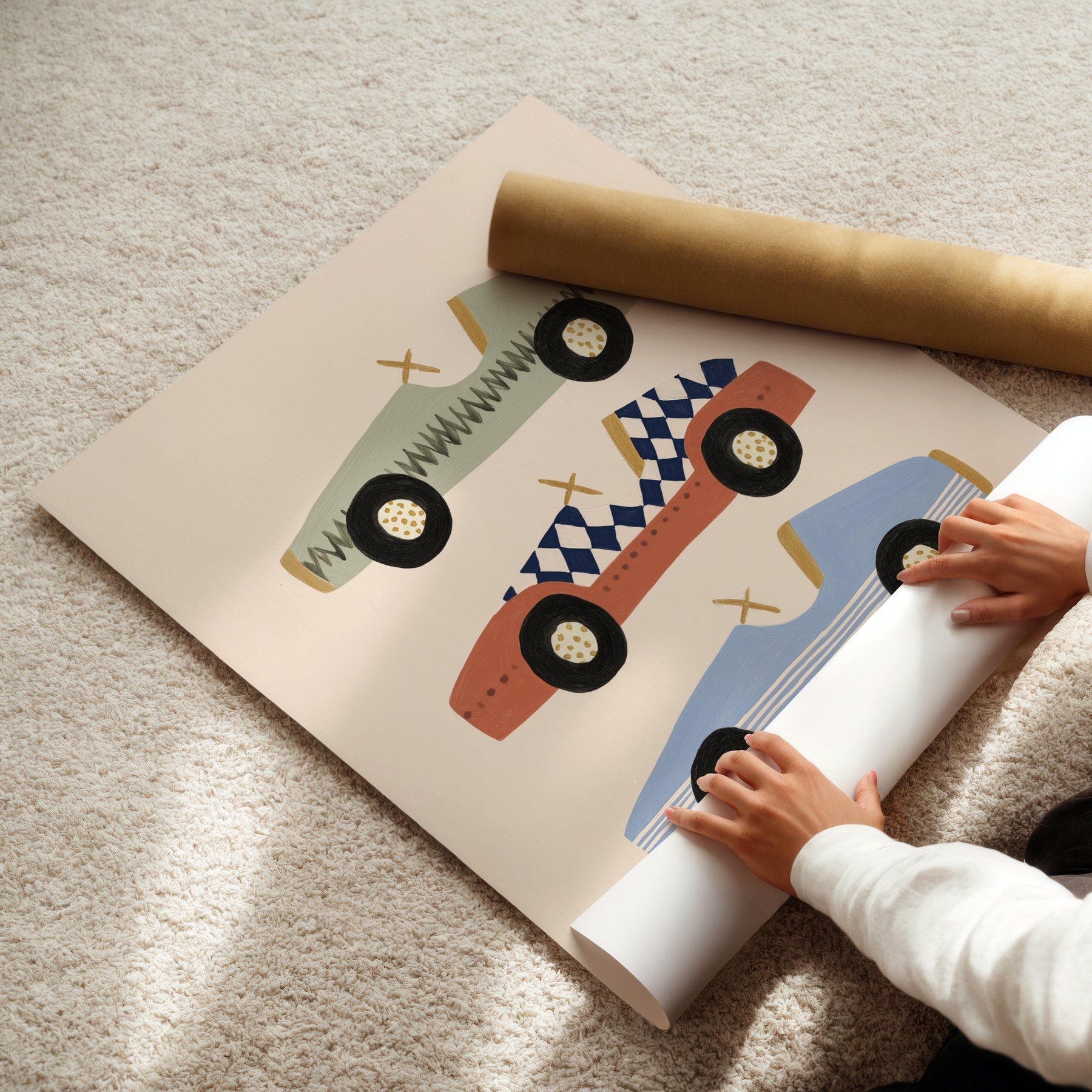 Three charming vintage race cars stack vertically on a soft beige background, each featuring unique patterns and colors - sage green with zigzag details, terracotta with navy diamonds, and powder blue with horizontal stripes. The hand-drawn details including golden racing flags and textured wheels create nostalgic appeal. This retro-inspired illustration brings classic automotive charm and adventure to nurseries with its sophisticated color palette.