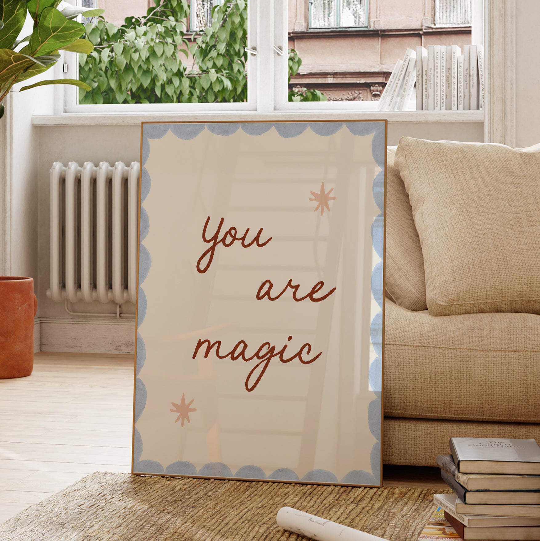 The heartwarming message "you are magic" flows in rich brown script across a white background, beautifully framed by a soft powder blue scalloped border and accented with delicate peachy stars. This gentle affirmation piece creates a soothing, encouraging atmosphere in children's spaces with its calming color palette. The hand-drawn typography and folk art border details bring warmth and personal touch to this meaningful wall art.