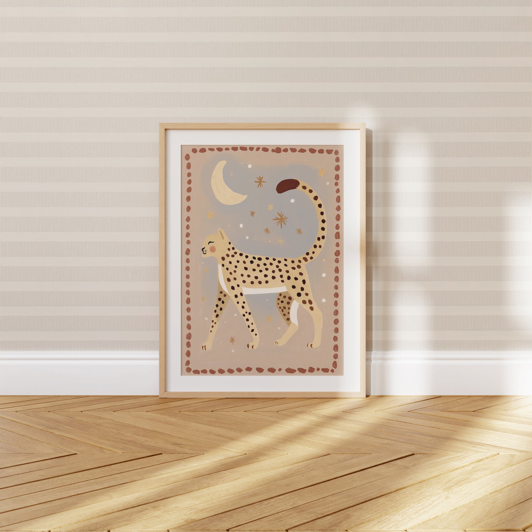 A playful golden leopard covered in brown spots prances beneath a cream crescent moon on a soft peachy-beige sky scattered with white and golden stars, all framed by a rustic terracotta scalloped border. The leopard's joyful pose with raised tail creates a sense of movement and delight. This charming folk art piece brings warmth, celestial magic, and safari personality to nurseries with its vintage-inspired design.