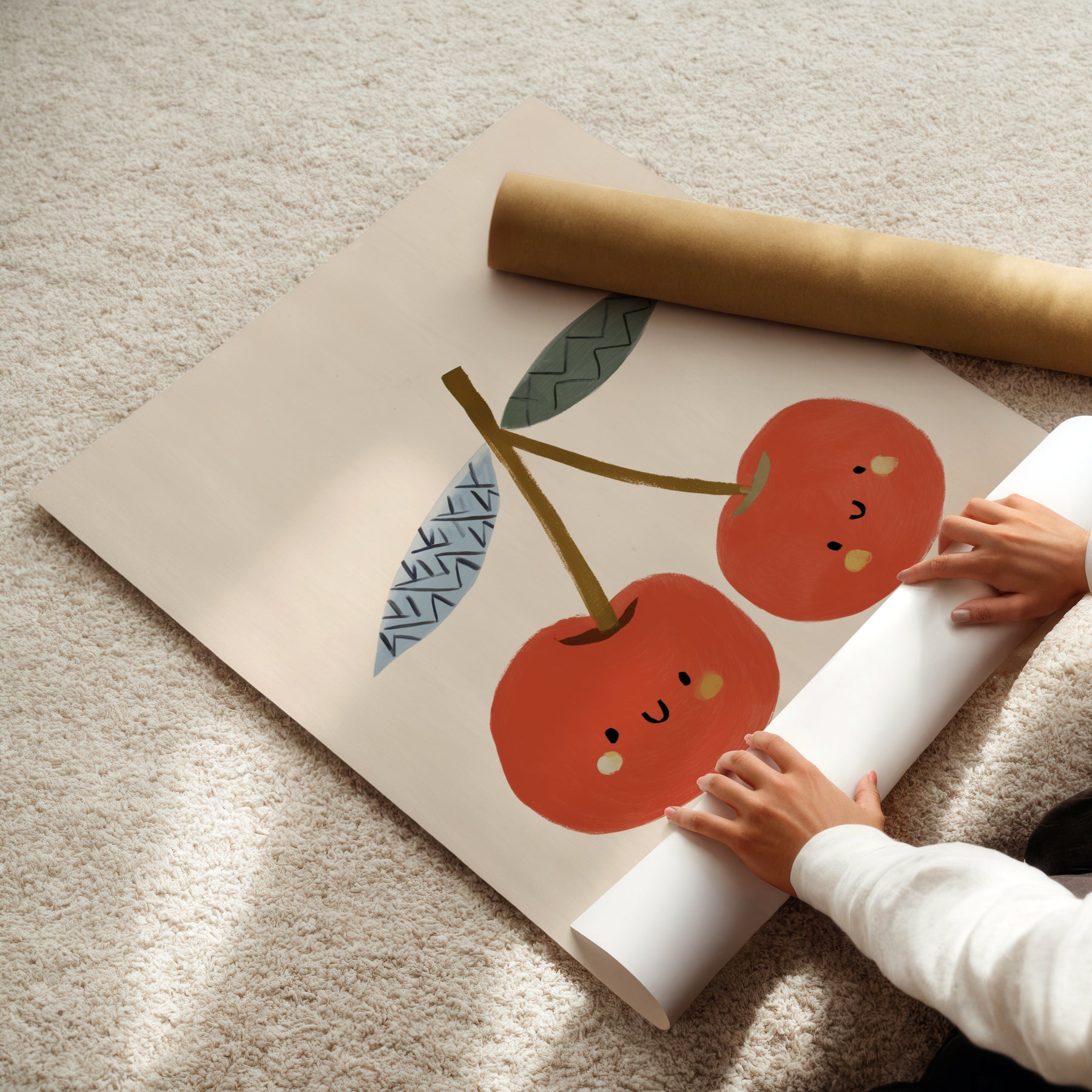 Two cheerful red cherries with sweet smiling faces and rosy cheeks hang from brown stems adorned with beautiful patterned leaves in powder blue and sage green against a soft beige background. The hand-drawn details and friendly expressions transform these simple fruits into delightful characters. This charming illustration brings fresh, wholesome sweetness to nurseries and kitchens with its playful fruit friends and gentle color palette.